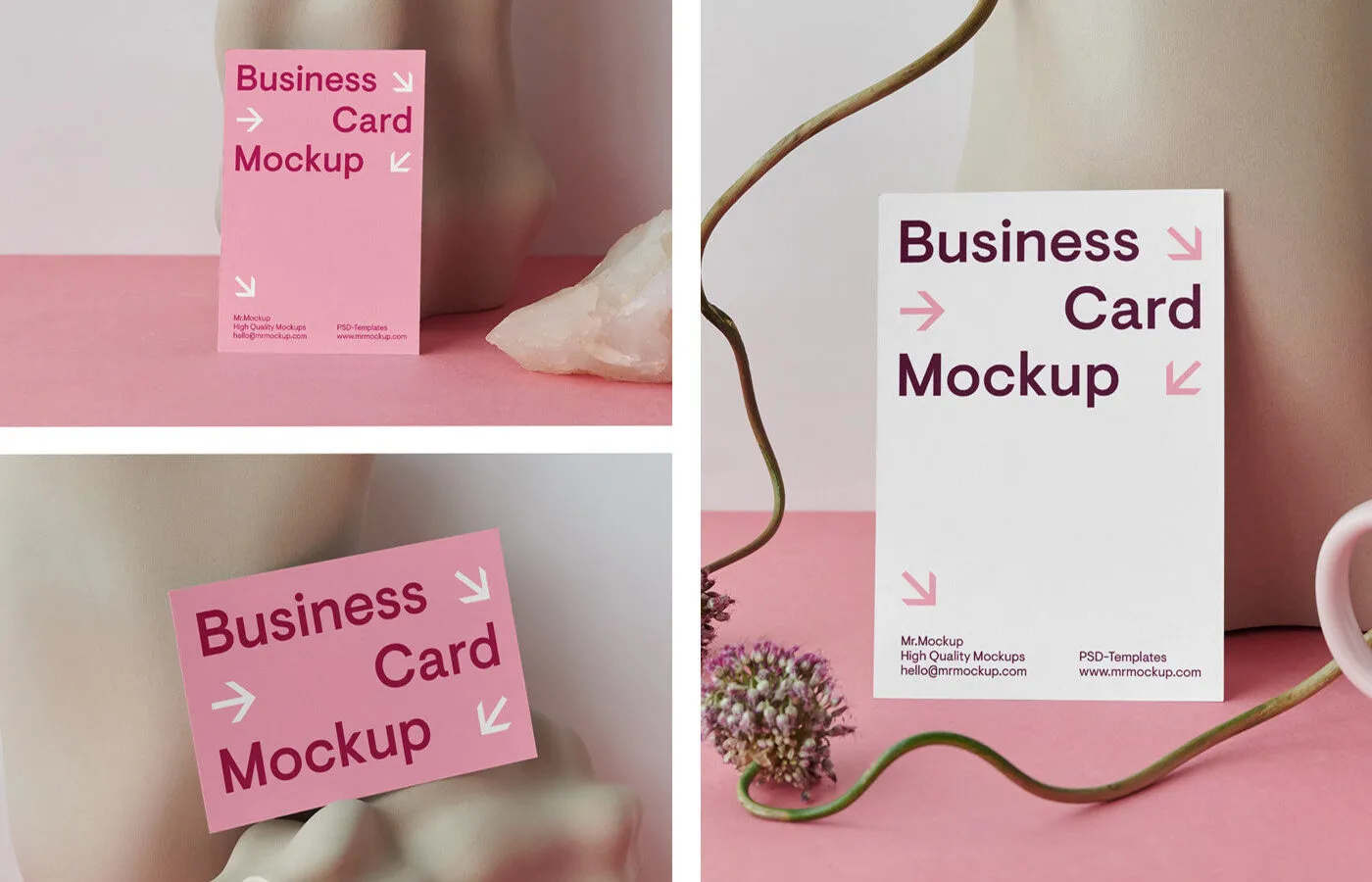 3 Business Card Mockups with Unique Vase in Front Sight