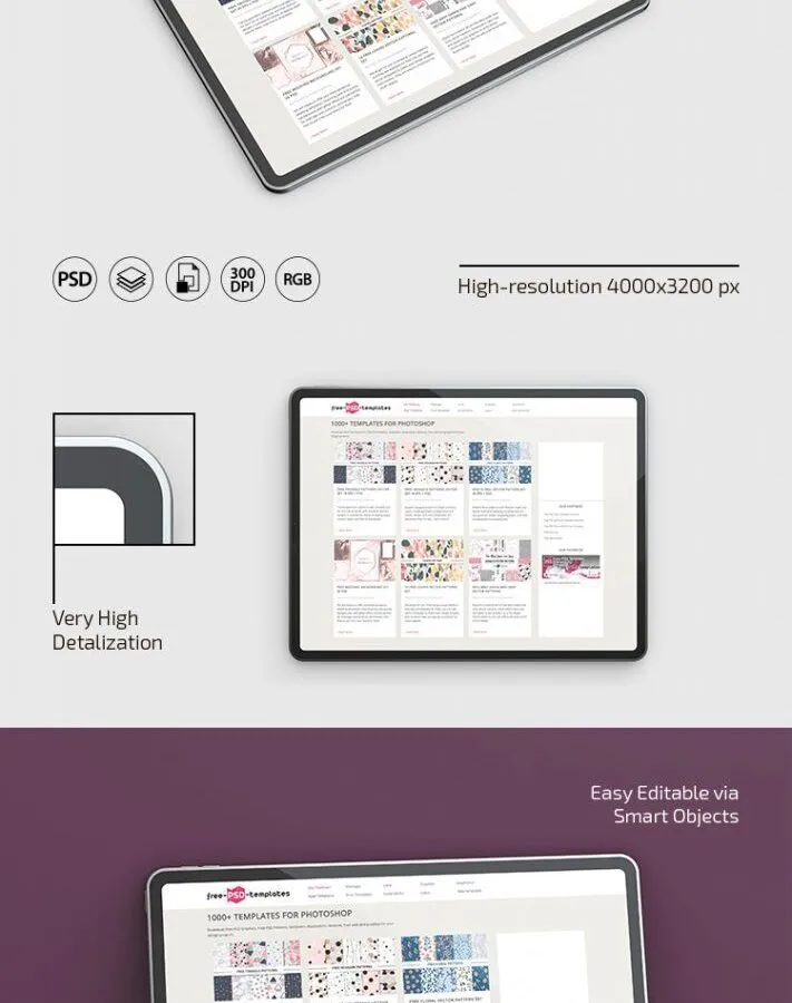 Creating professional and outstanding previews of your digital designs won’t take more than minutes, as long as you download this gorgeous design resource. The PSD files offer 3 detailed presentations of a tablet displaying your specific artwork on its screen. Enjoy!