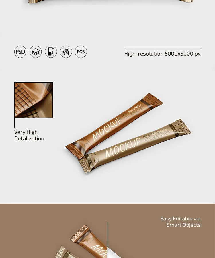 You’ll find three fully customizable PSD files in the download file displaying different numbers of stick sachets in top and perspective views. All that you need to do is to insert your graphics, and just like that, you’ll be good to go. Numerous freebies are waiting for you on .