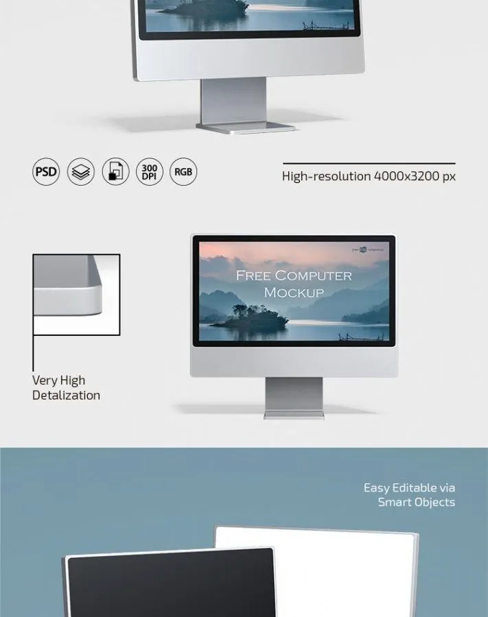 There are two shots taken in the half-side view in addition to one in the front view. One of the shots comes with a pair of monitors. These PSD mockups come with a plain scene that can be modified according to your preferences. It’ll take you no time to get your desired outcome.