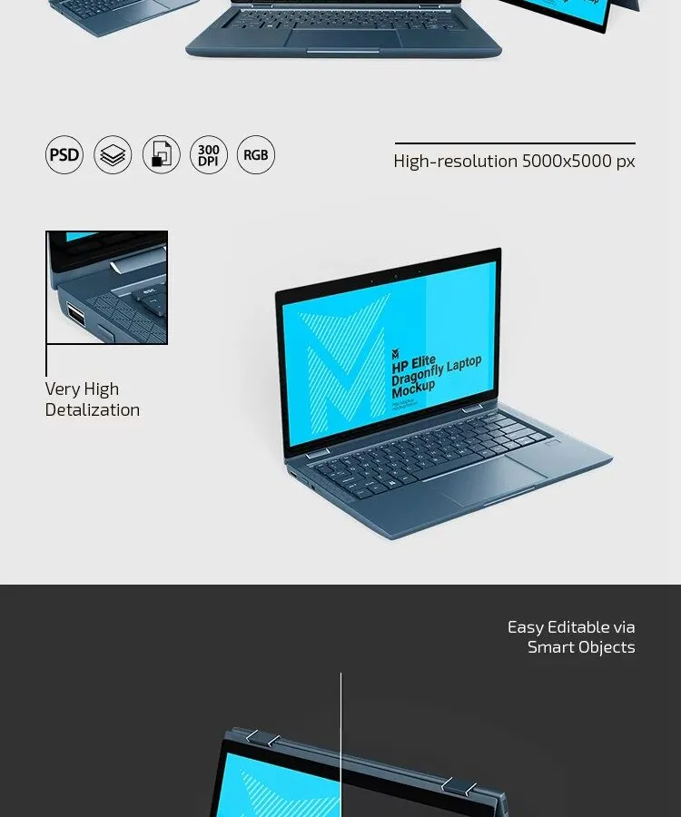 3 Mockups of HP Elite Dragonfly Laptop in Varied Views