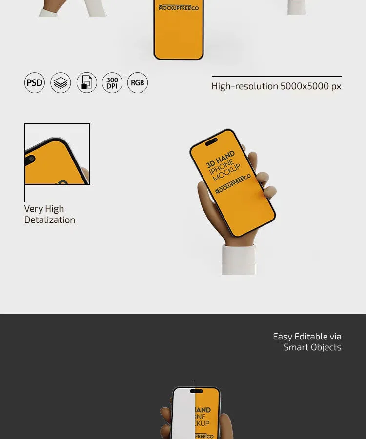 3 Shots of iPhone Mockup in 3D Hand