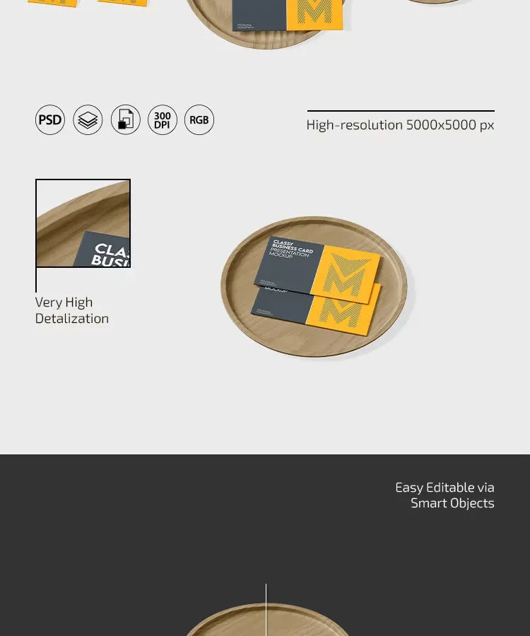 3 View of Business Card Mockup with Wooden Plate