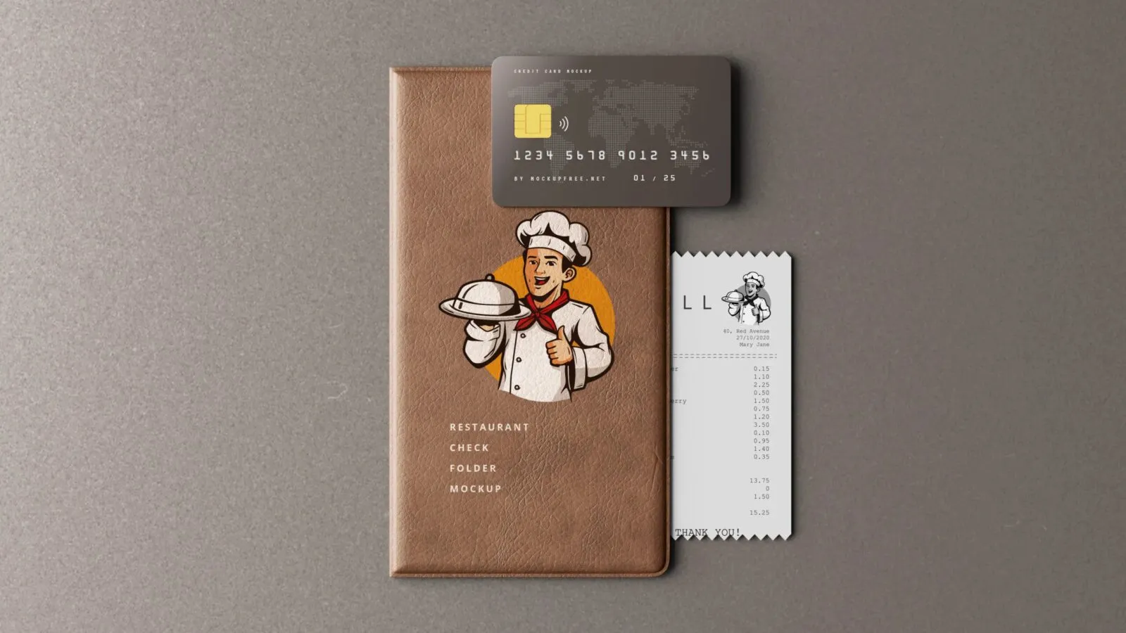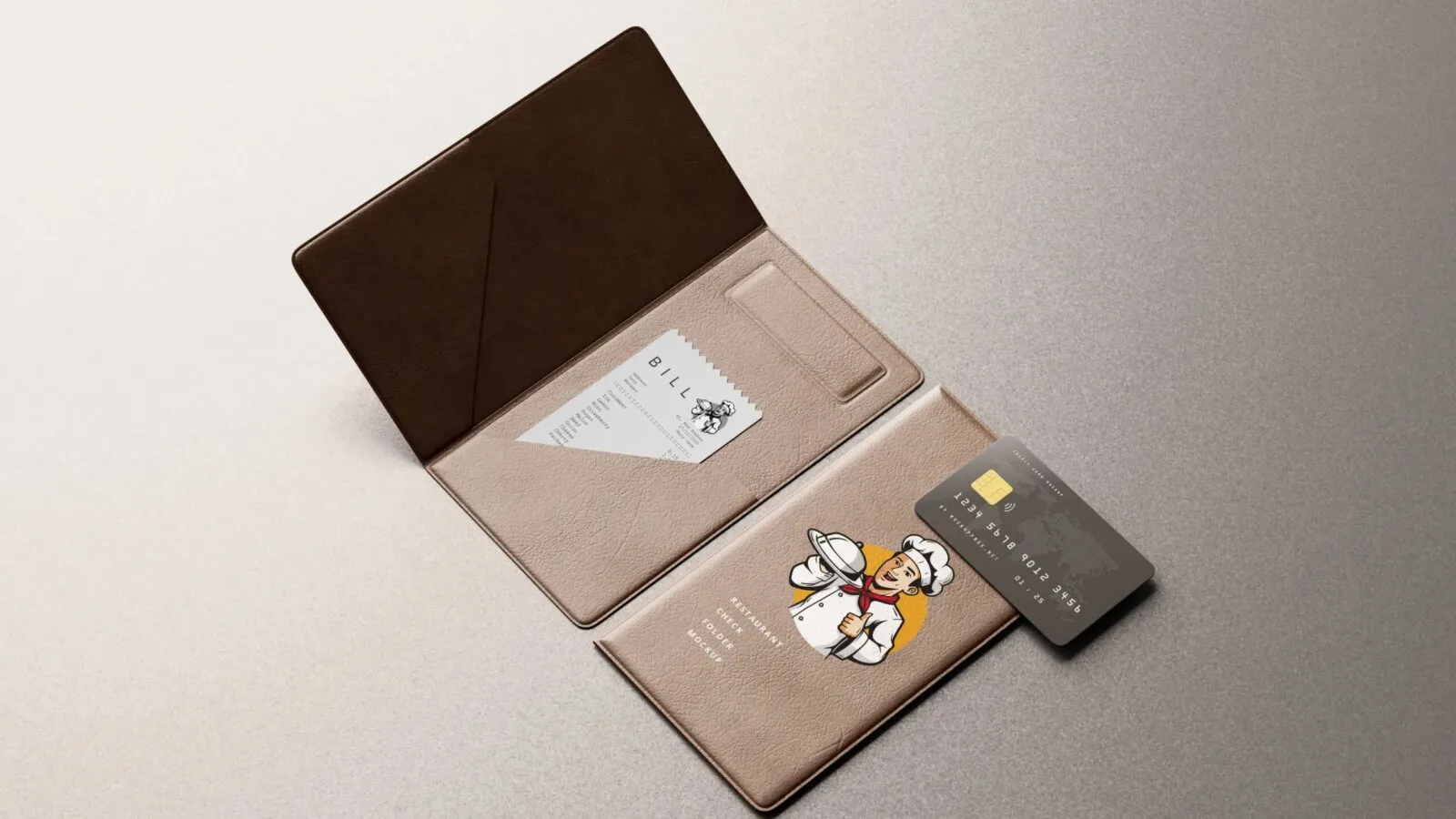 5 Restaurant Check Folder & Credit Card Mockups in Varied Shots