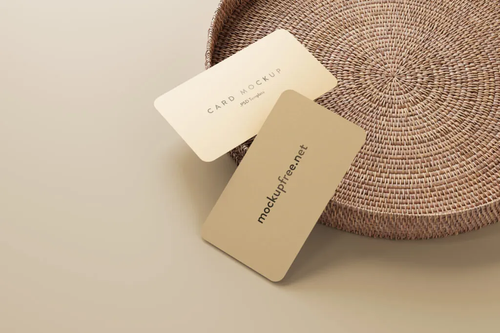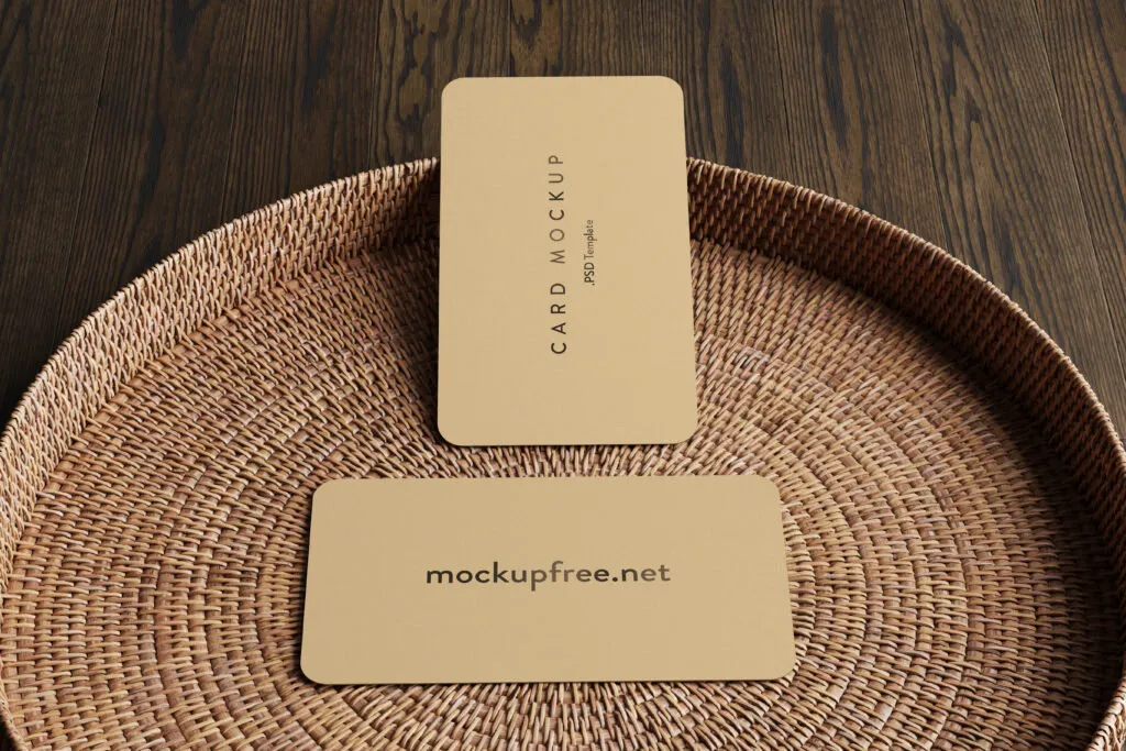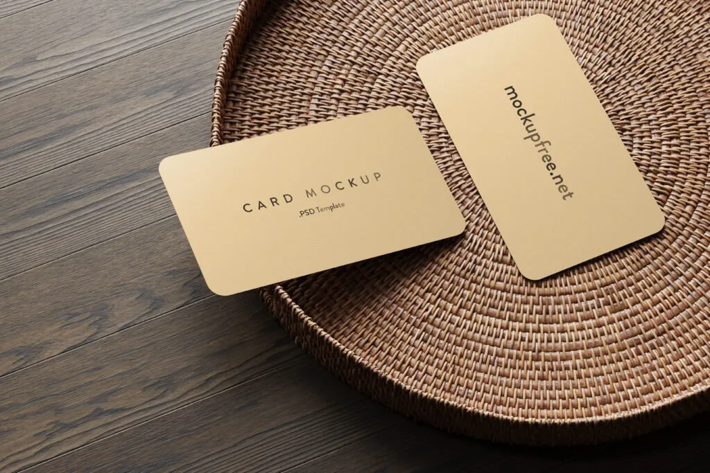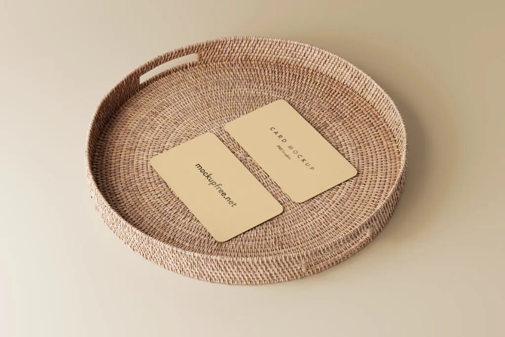 These on a wicker tray are an exquisite collection with all the well-arranged elements waiting for you to grab and admire. The rich texture of the wooden tray gives the scene an organic and natural quality, while the business cards present a professional set.