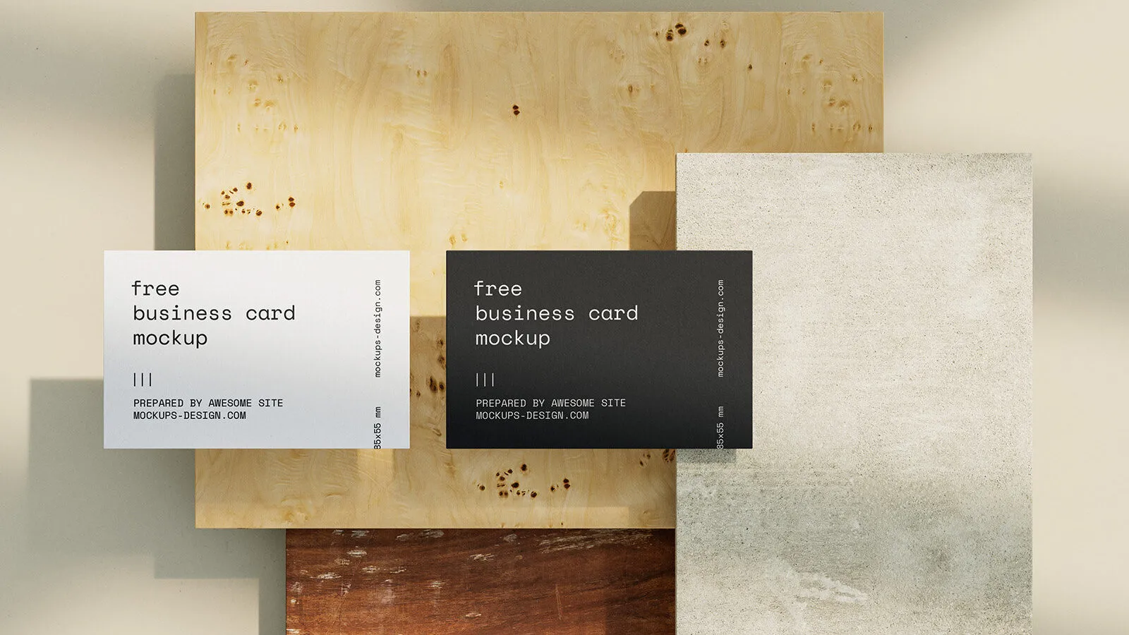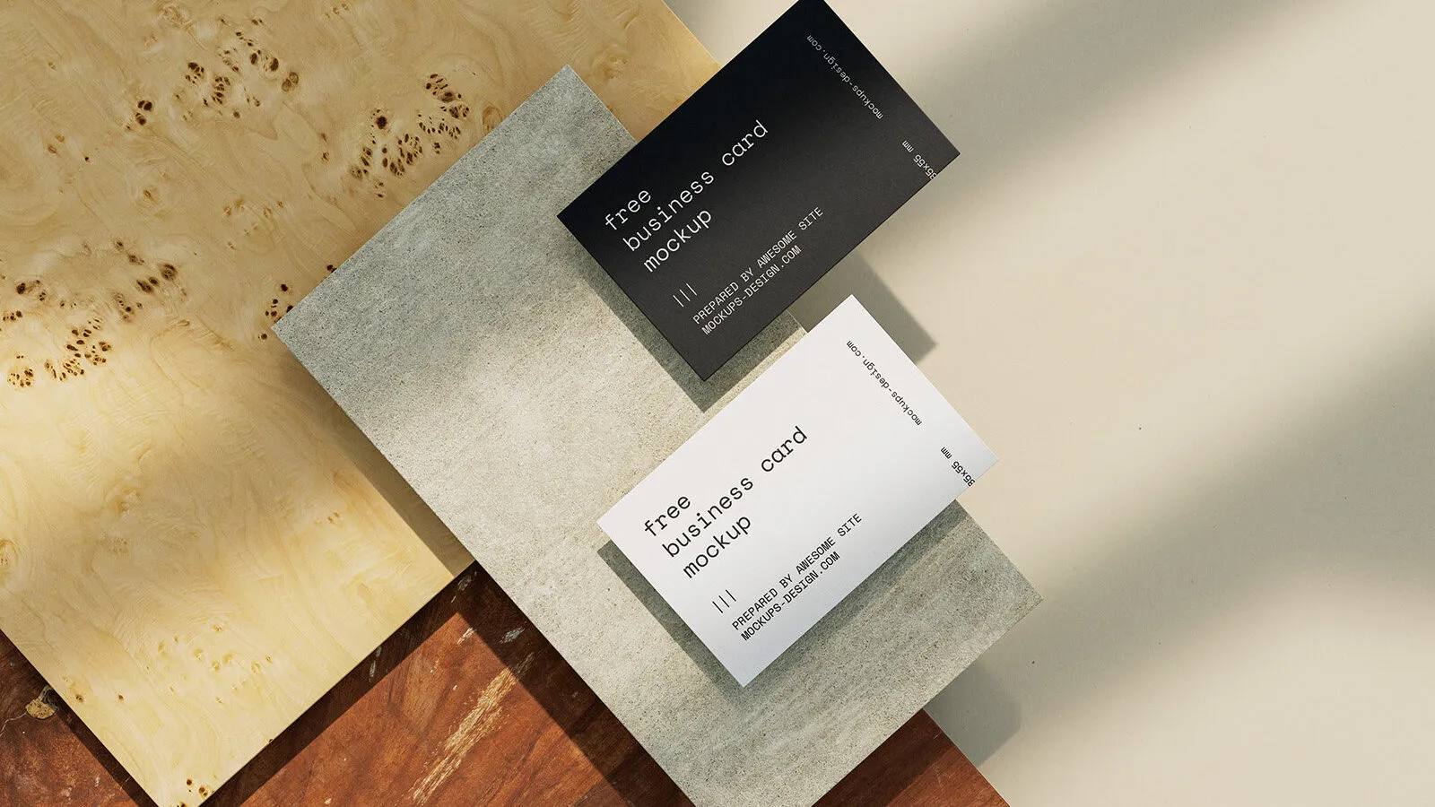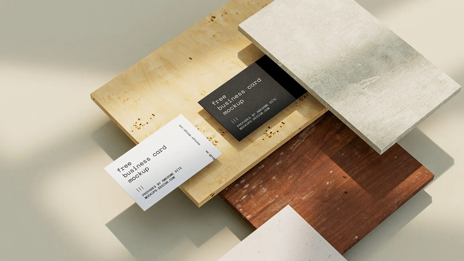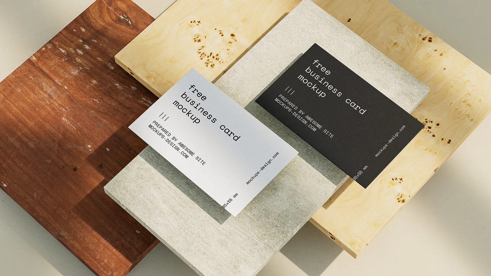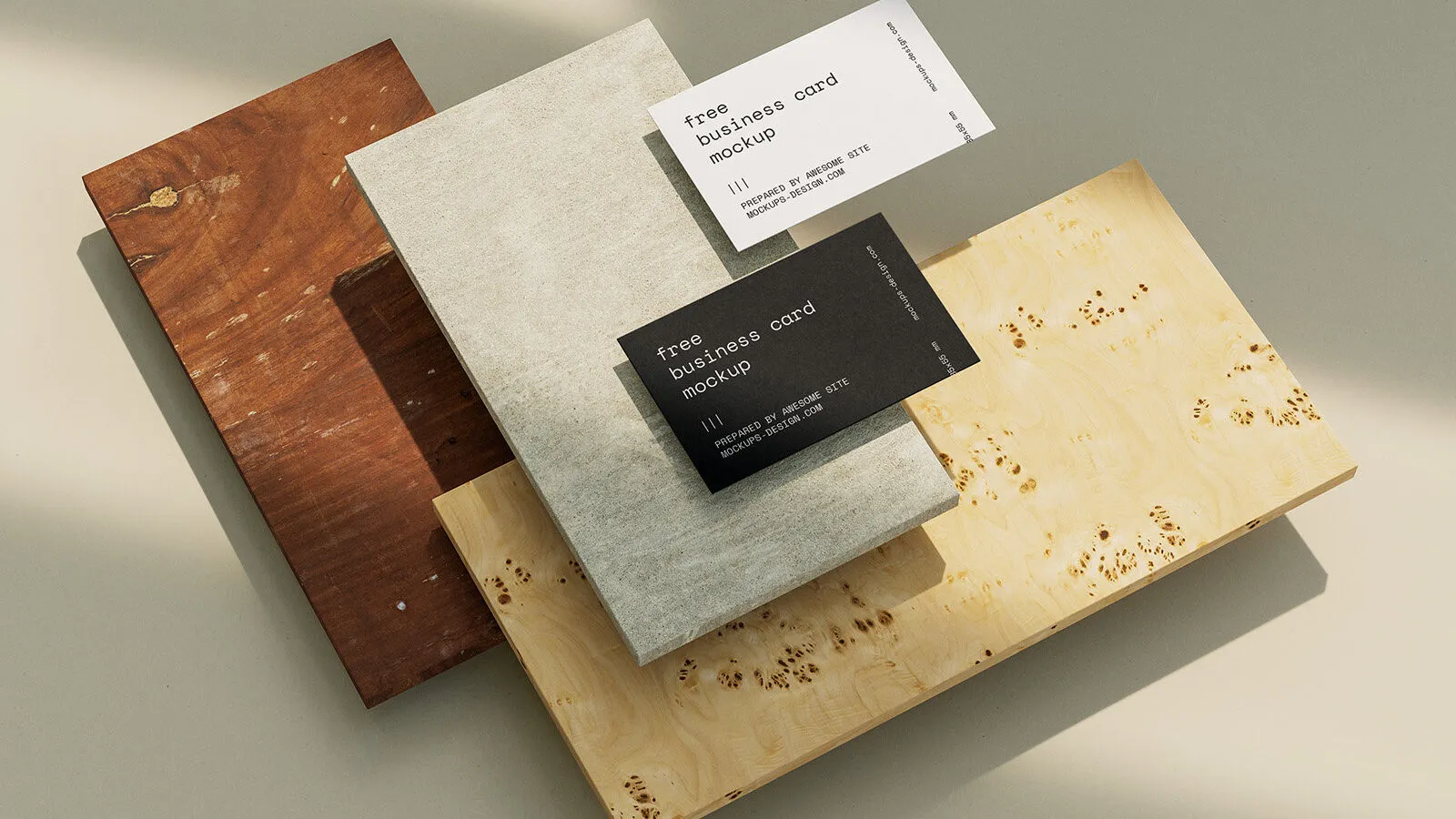 As a tangible member of advertising, business cards can leave an important impact on clients, and having a professional presentation like this will be a perfect choice. Five shots of this design tool show two cards that are placed on tiles.