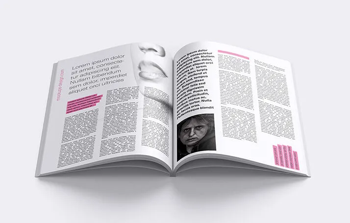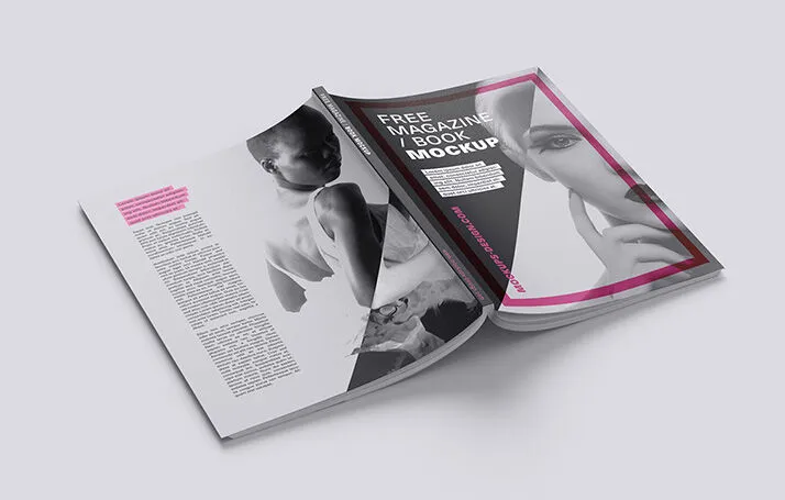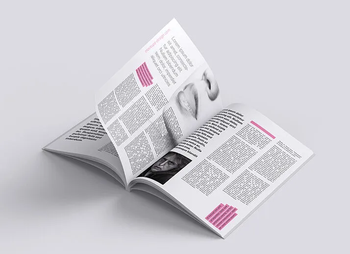 This mockup includes an open magazine on a white background, allowing you to customize it by adding your designs, changing the background color, and adjusting the shadows. It’s designed for easy editing, saving you time and resources while effectively presenting your work.