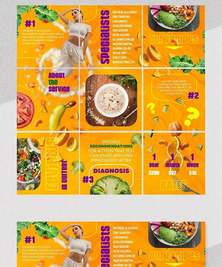 With nine nutrition templates with a warm background and various flying foods, this pickup would be amazing for your page. Customize the photos, words, colors, and other changeable features to personalize it, and if you like to have various items for your other projects, visit our website and have delight.