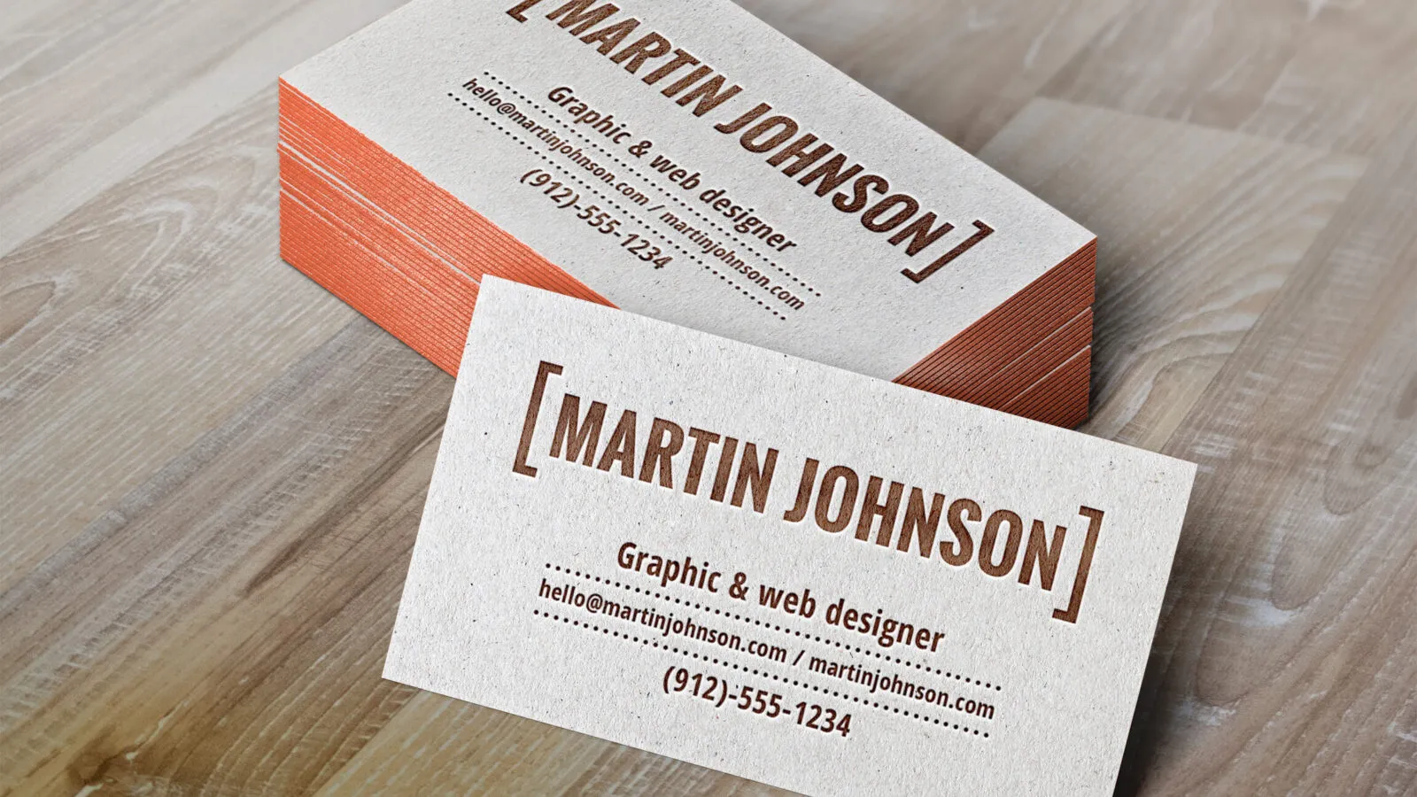 The scene is set against a wooden surface, enhancing the visual appeal of your designs. The cards feature a letterpress printing effect that adds a touch of elegance to your illustrations. Additionally, you have the option to customize the side color of the business cards, providing flexibility to match your brand’s style.