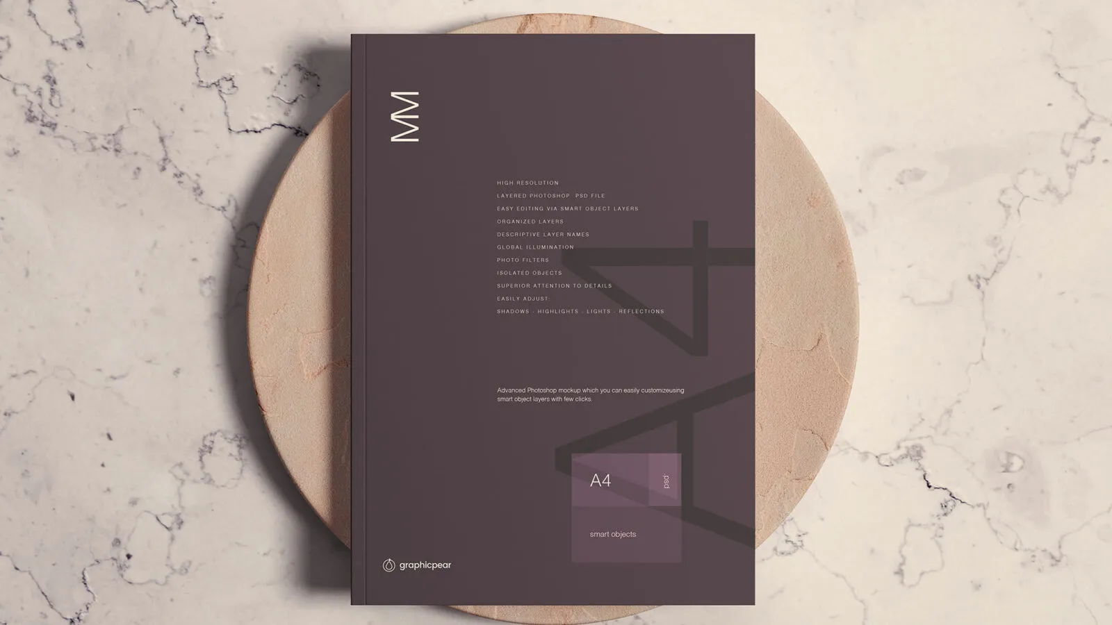 Showcase your A4 magazine cover design in a contemporary setting with this mockup. The design is featured on a circular object placed against an elegant marble background, creating a modern and stylish presentation.