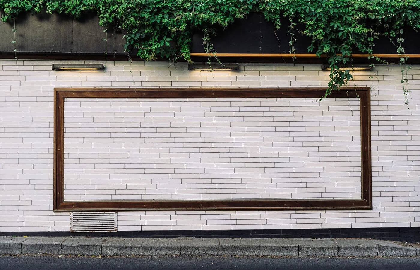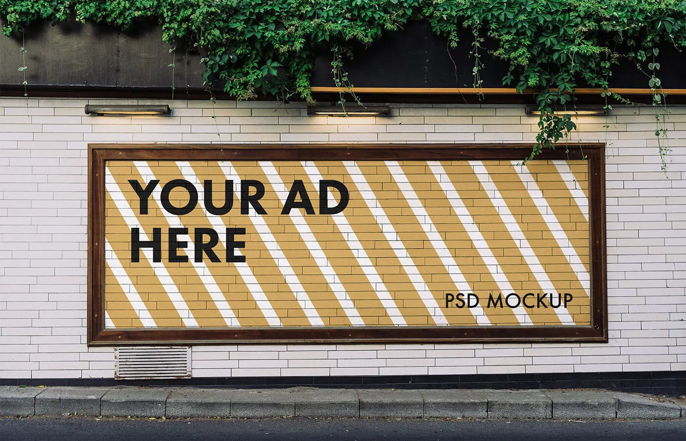 The Advertising Outdoor Roadside Billboard on Brick Wall Mockup offers a realistic outdoor setting for showcasing your branding designs. This mockup features a framed billboard attached to a simple brick wall, enhanced by greenery cascading from the top. This natural element adds a 3D perspective, making it ideal for designers looking to create impactful visual presentations.