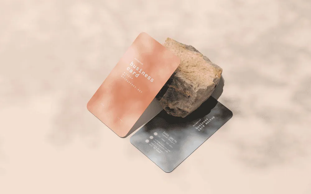 Our freebie today is perfect for professionals looking to make a lasting impression. This animated mockup shows a realistic view of two business cards with rounded corners leaning on a rock. The shadow of the dancing leaves on these cards adds a unique twist that will set you apart from the crowd.