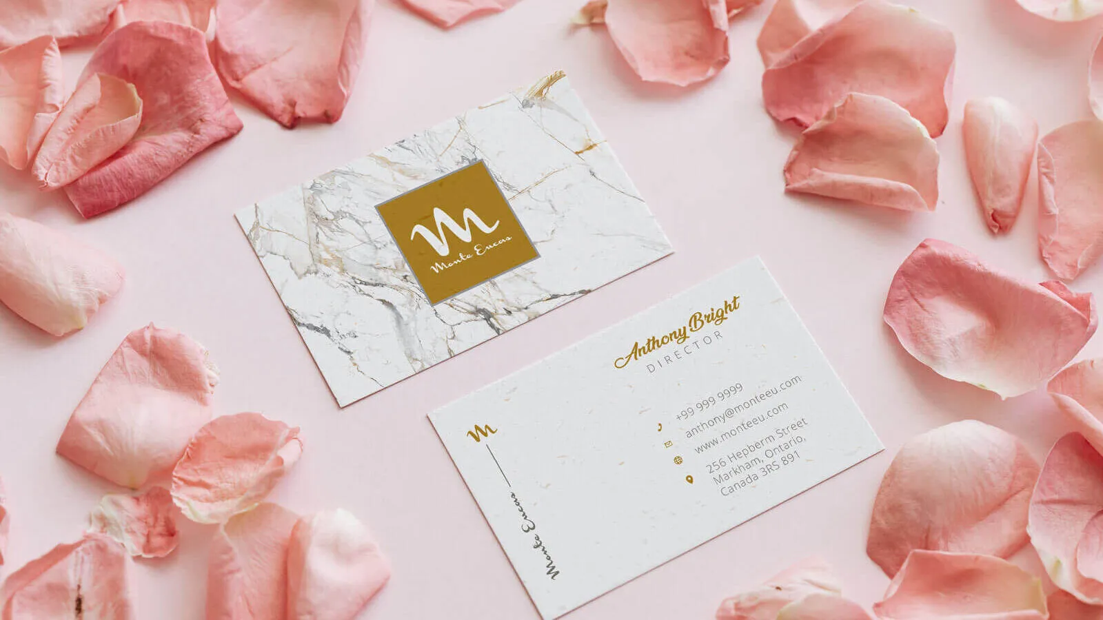 This mockup showcases both the back and the front design of your business card with some pink rose petals around with makes your presentations very aesthetically pleasing. Simply get the well-layered PSD file of this for free and add your own brilliant designs via the smart layers in just a few easy clicks.