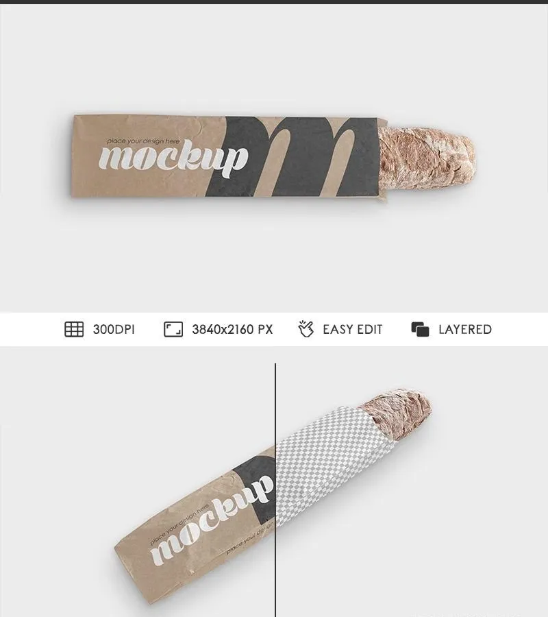 Baguette in Kraft Paper Bag Mockup in 2 Sights