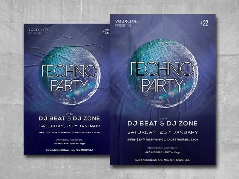 Included in this download is a PSD flyer layout featuring a large centerpiece of a disco ball with the title written on it. You can change it with your own title in no time through text tools. This gorgeous flyer comes with a background in eye-catching shades of blue and has enough room to add your info about the event. If you need more gradient themes for future projects try our.