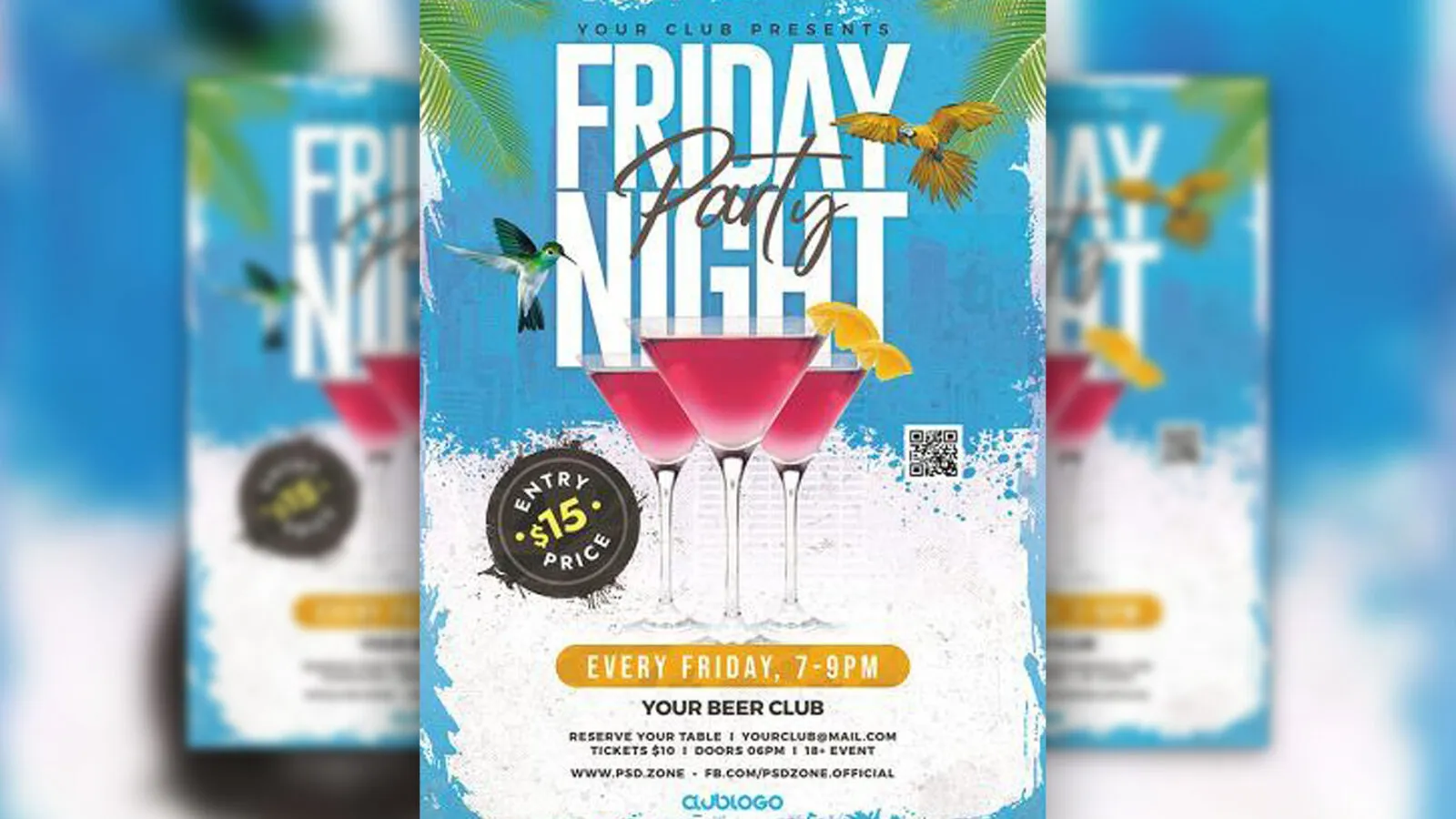 Well, looks like what we have for you today is one creative cocktail . How cool is that? The layout is divided into 2 parts regarding the color, blue and white. The blue area exhibits the title in bold typography with birds on either side. The white spot, though, is mainly dedicated to text details about the party. In between these two, there are 3 glasses of cocktail with lemon.
