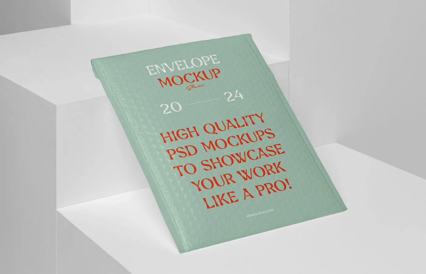 The Bubble Envelop Mockup in Perspective View offers a realistic way to visualize your branding on bubble envelopes. This mockup showcases the envelope in a unique perspective, giving the impression that it contains an item like a book. This setup allows you to see how your design will appear in a real-world context.