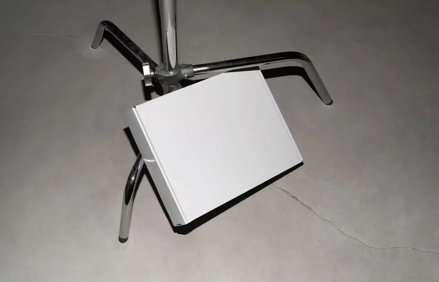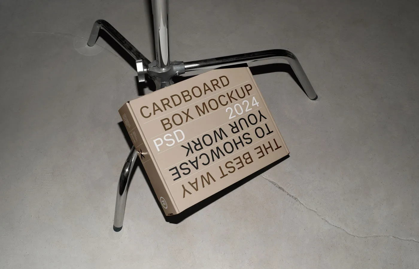 Showcase your products with a modern touch using the Cardboard Box on Tripod Mockup. This minimalist PSD file features a white cardboard box set on a metal tripod stand, offering a gallery-like focus on your packaging. You can easily add your logo and design through smart object layers to achieve a realistic printed appearance that emphasizes sharp corners and a professional look.