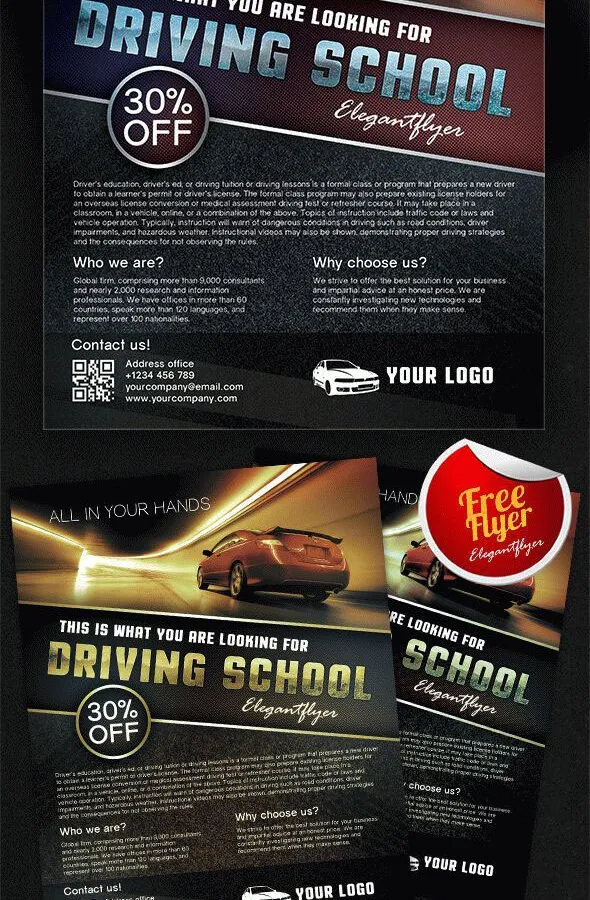 A good first impression is essential in attracting clients, which usually is made through good advertisements and flyers. If you don’t know how to design one, don’t miss today’s product. This product is a clean dark driving school flyer template. This flyer can be used for any promotion and introduction.