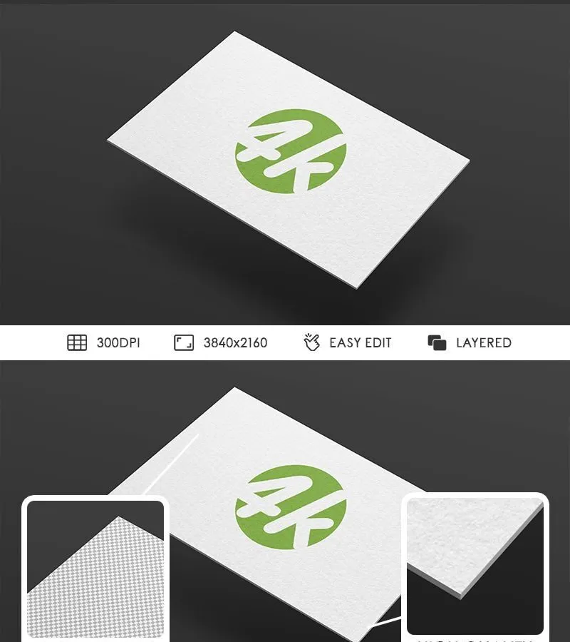 The layout’s minimal design ensures that the focus remains on the business card itself, creating an impressive presentation. Positioned on a black surface, your graphics will stand out even more, especially if you use bright colors in your design. This mockup provides a professional way to present your work.