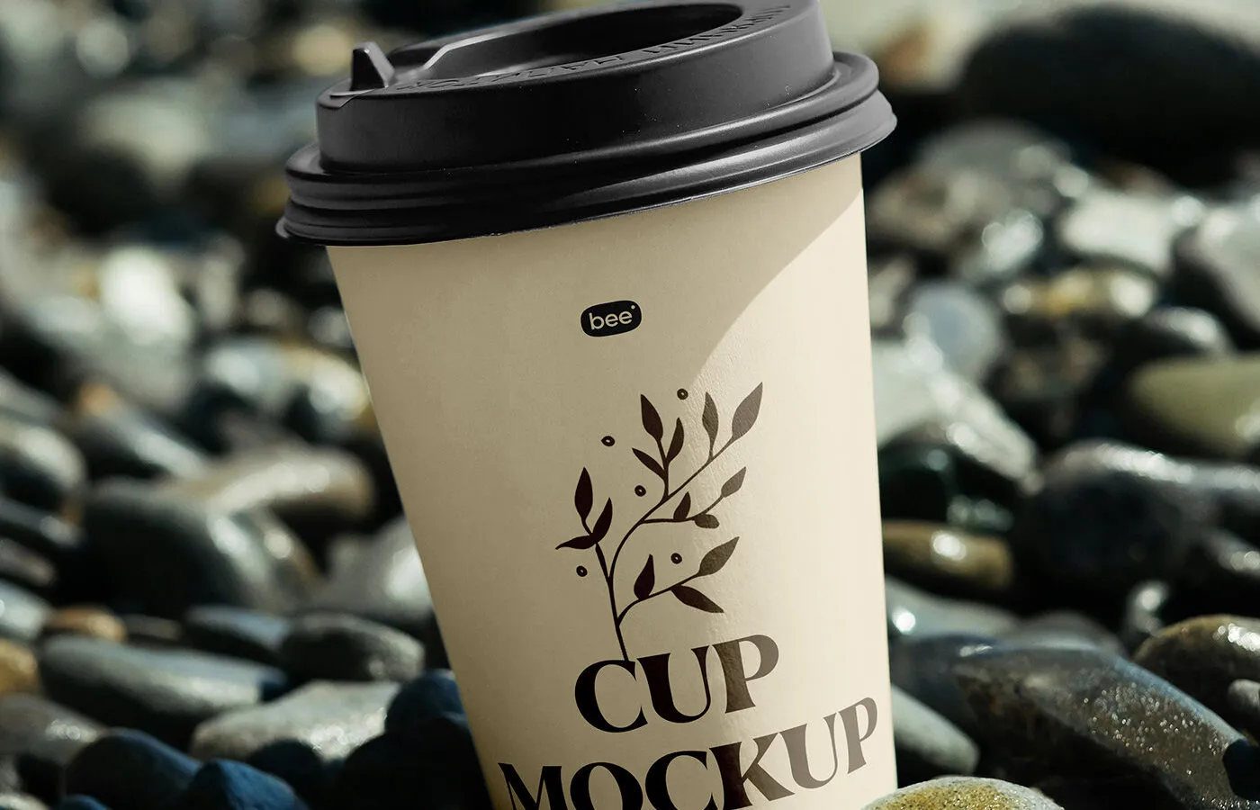 This mockup offers a close-up view of a paper cup placed on a stone beach, creating a relaxing and warm atmosphere. It is an ideal tool for showcasing your branding in a natural setting, giving your design a friendly and lifelike appearance.