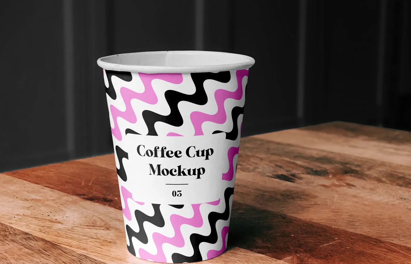 The Coffee Cup Mockup on Wooden Table is a versatile tool for showcasing your brand’s design. It features a portable paper coffee cup placed on a wooden table with a dark background, providing a striking contrast that highlights your design. This mockup is ideal for creating a memorable presentation that draws attention to your brand.