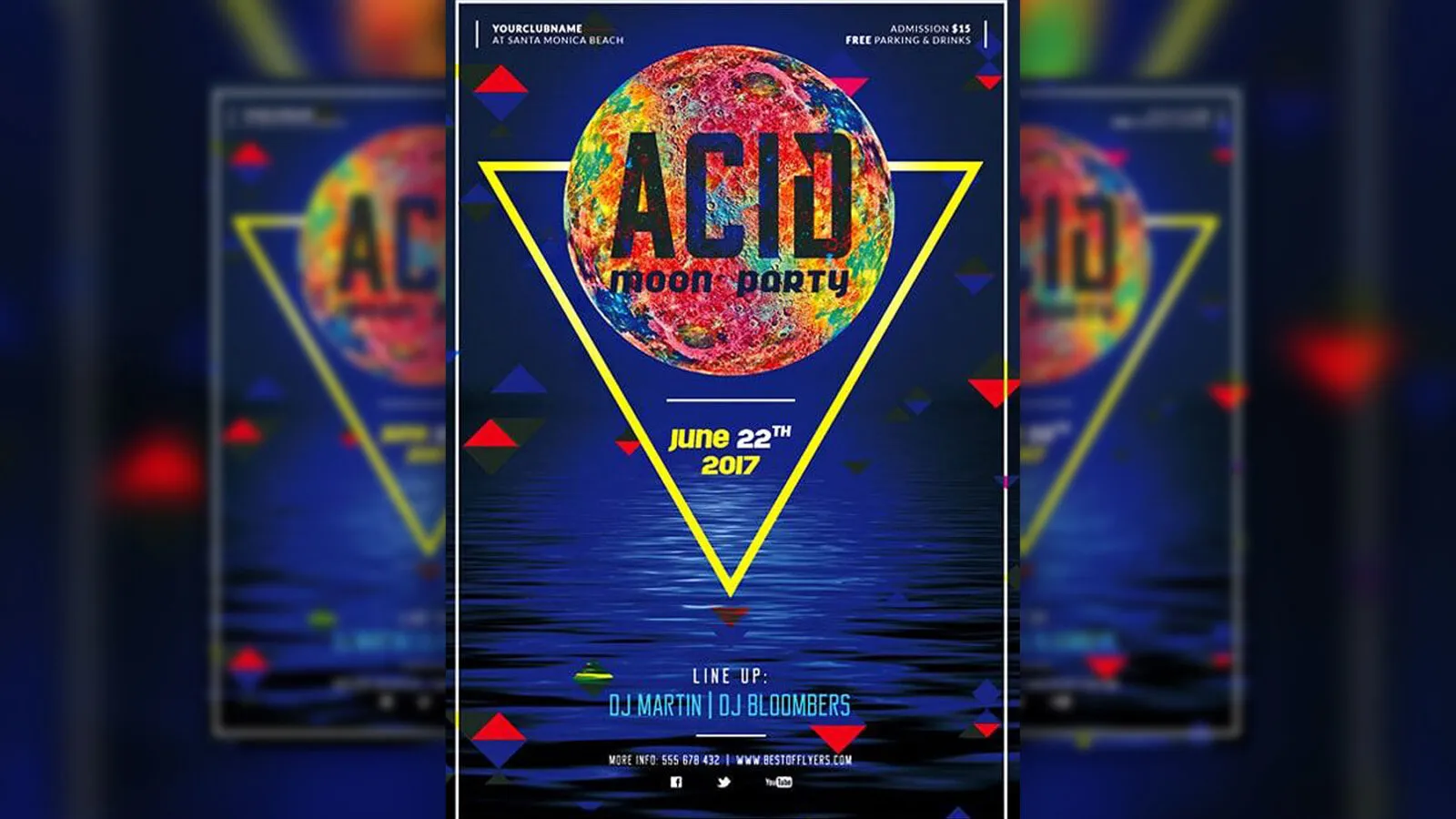 This flyer that we are introducing is very unique and special compared to others. The design has been worked on specifically to attract whoever views it! The beautiful bold moon has a colorful rainbow effect, and it’s placed in the center of the blue-themed flyer.