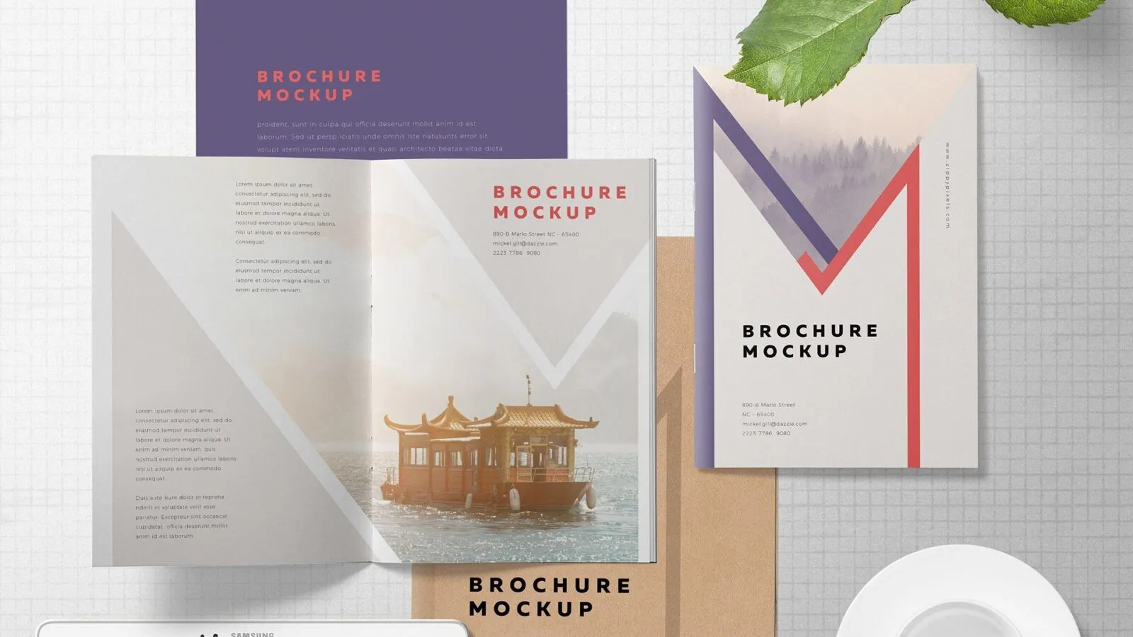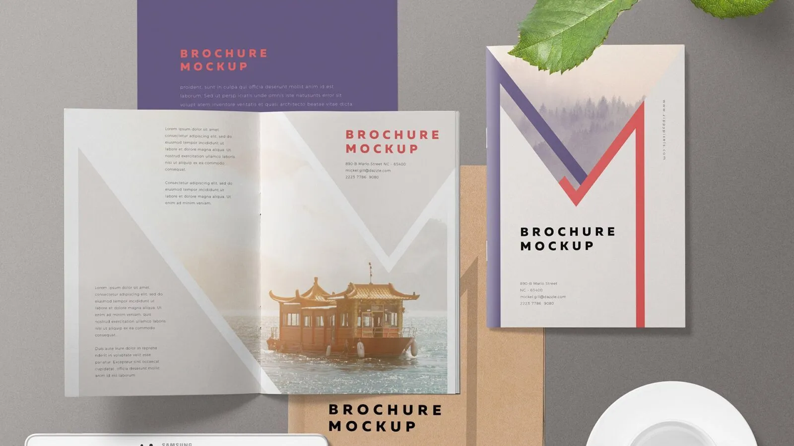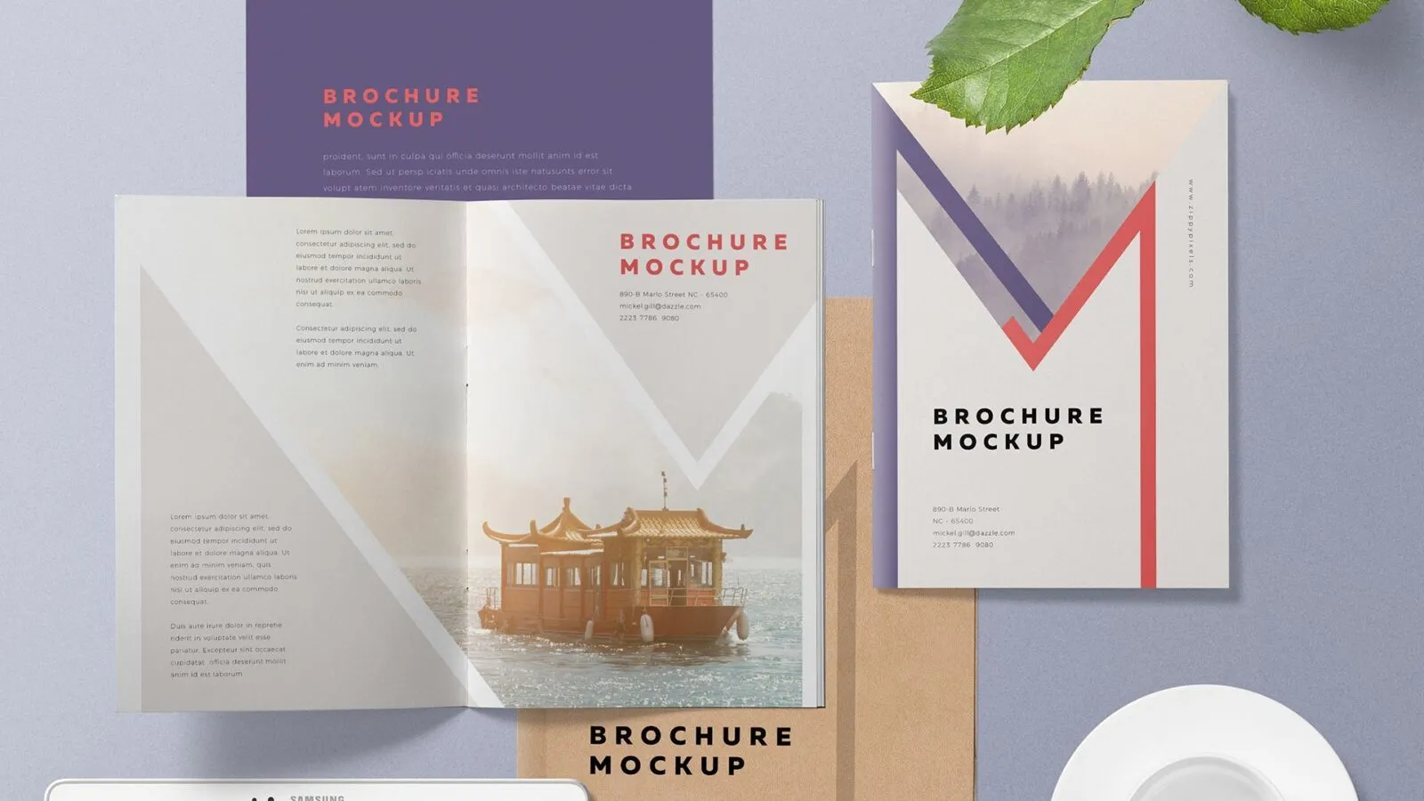 In this pack, you can find an open and close A5 size brochure, letterhead, file, cup with the plate, plant pot, and Samsung Tab. All in separate layers so you could design them individually or hide the ones you don’t need.