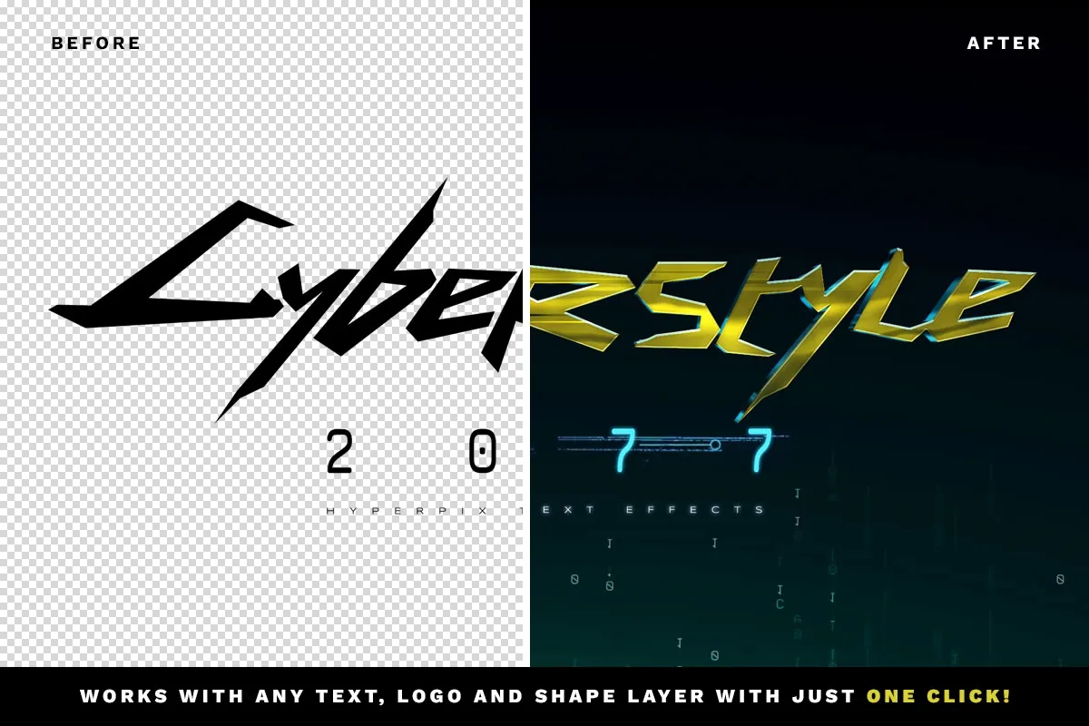 Transform your designs effortlessly with the Cyberpunk 2077 Text Effect. In less than three minutes, you can achieve striking results by applying this effect to any text, logo, or object using Photoshop.