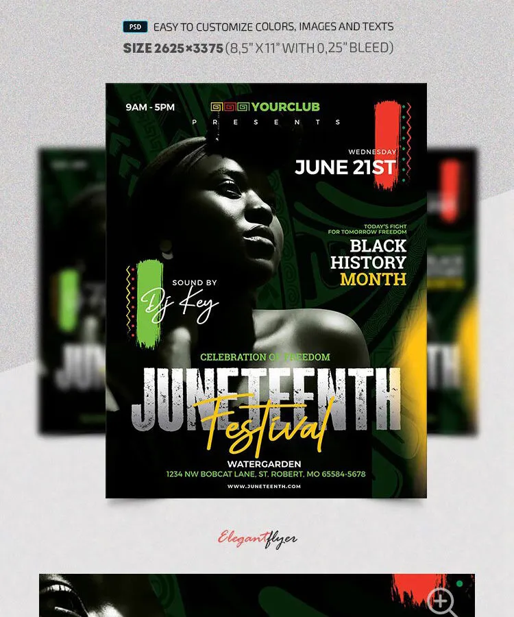 Are you captivated by this unique Juneteenth flyer template? Tweak the changeable details of this freebie using smart layers. Invite you to take a look at our African patterns in our library and use them for your present or future projects.
