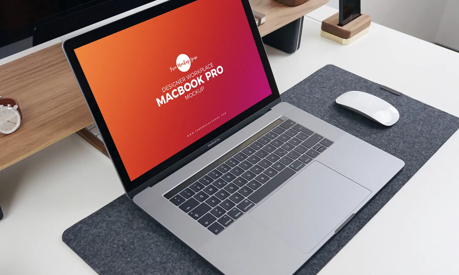 This Designer Workplace MacBook Pro Mockup offers a realistic setting ideal for web and graphic designers. The mockup depicts a workspace that includes a clean tabletop, a plant, a wireless mouse, a small clock, an iPhone X with a wooden stand, and a MacBook Pro, creating a lifelike office environment.