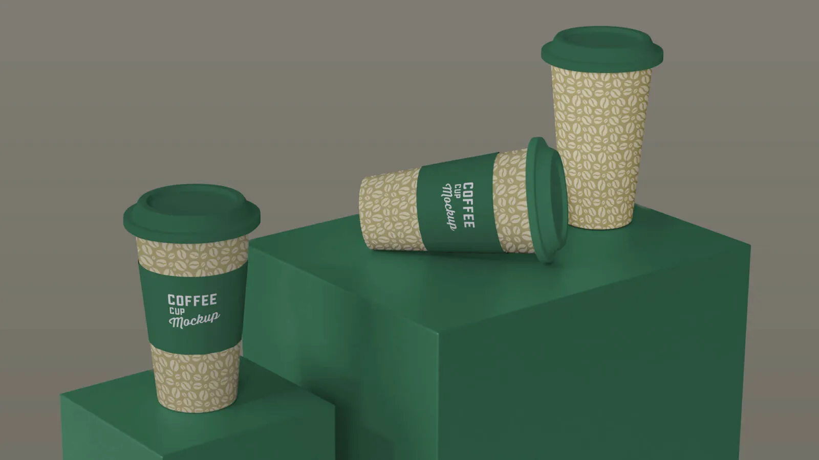 This mockup features three paper coffee cups, each placed on a green square stand and fitted with a cap. The cups are displayed from different angles, allowing for a comprehensive view of the design. You can easily add your own design to the labels with just a few clicks. This practical file is available for download.