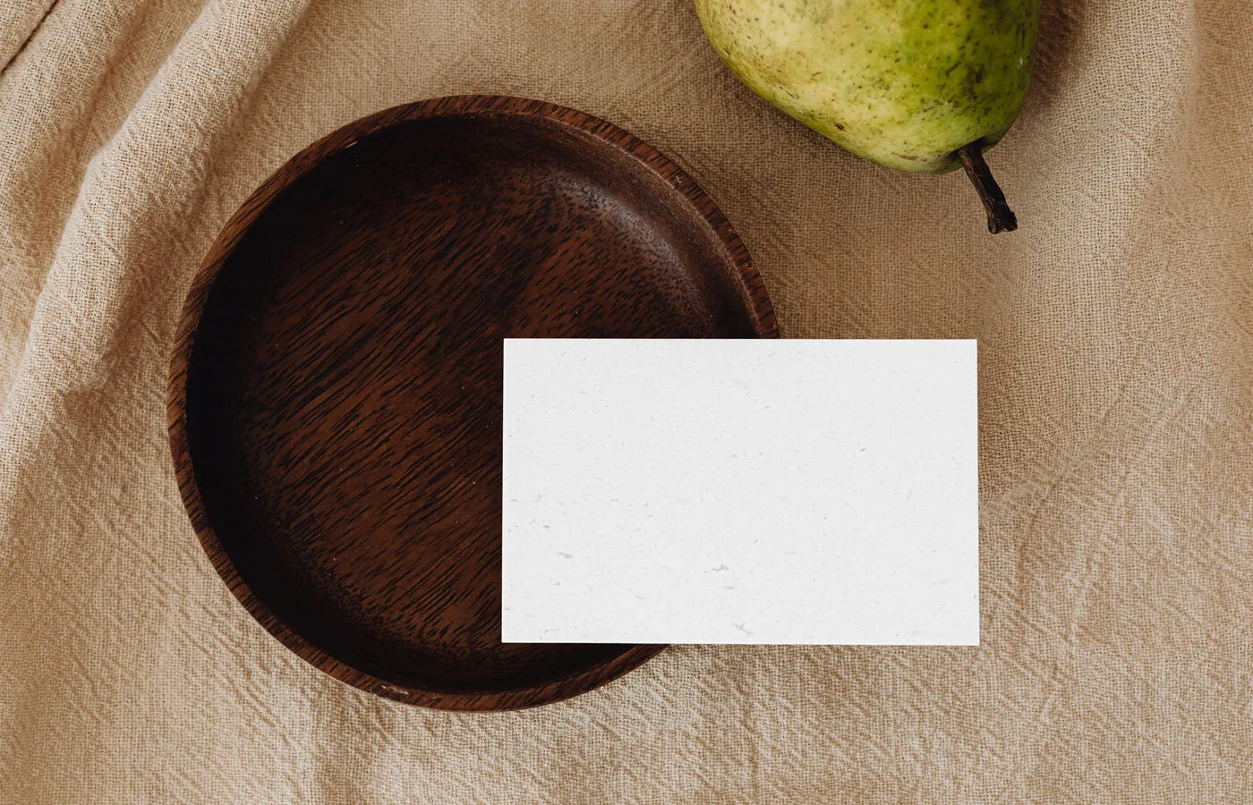 Eco Paper Card Mockup with Wooden Plate in Top Sight