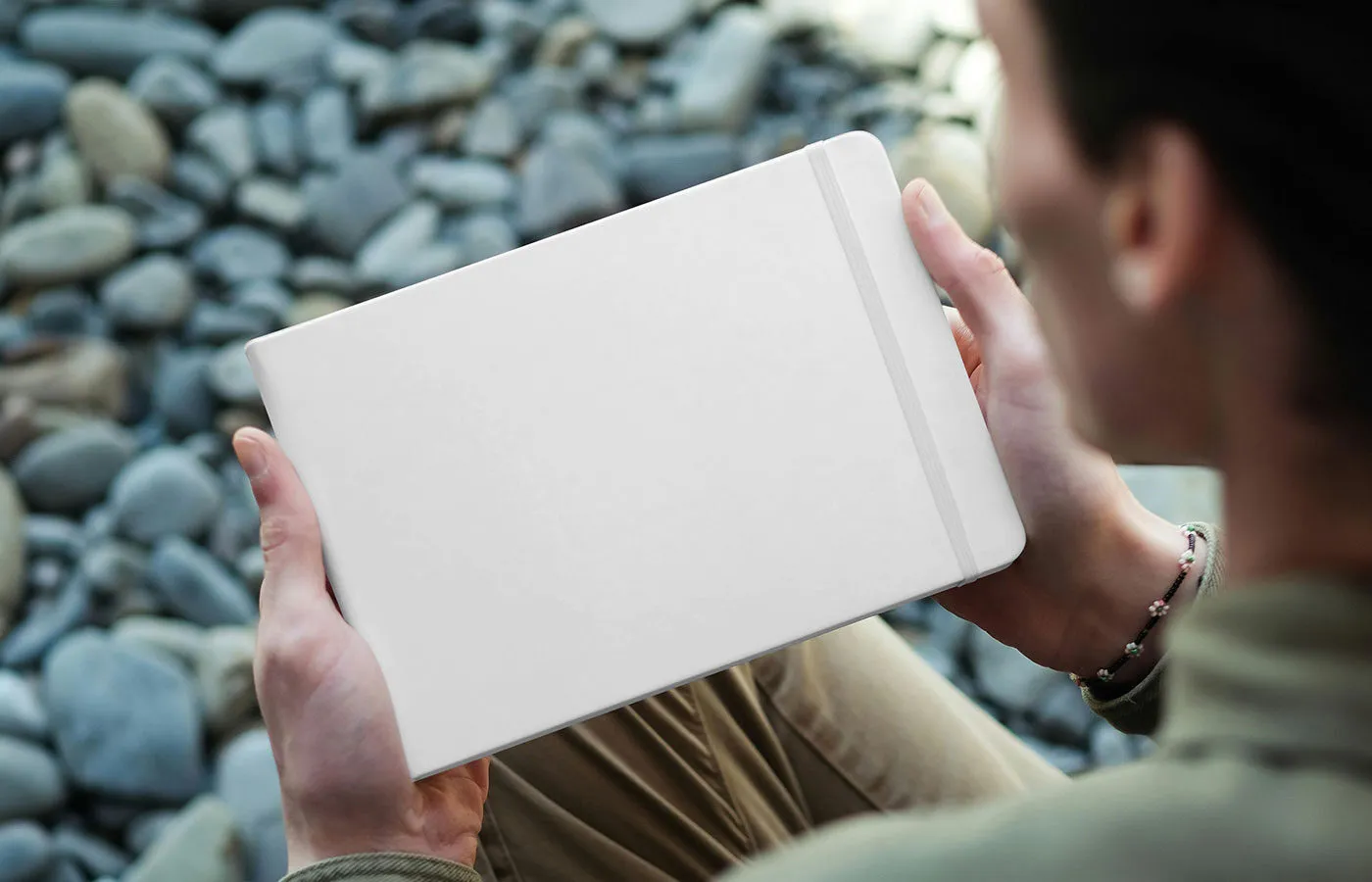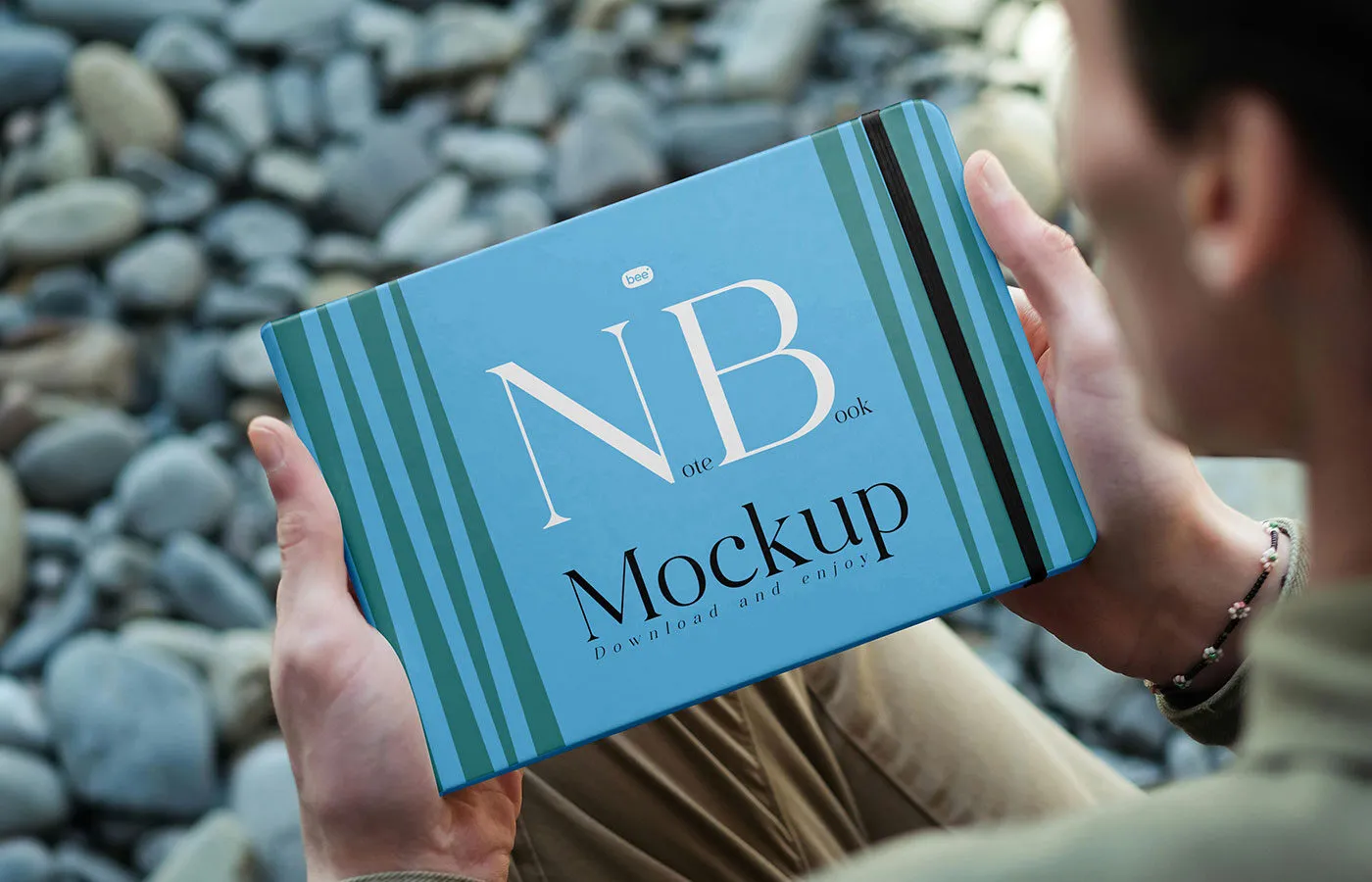 This free mockup offers a realistic way to showcase your design, making it memorable for your audience. The scene features a frosted background with a natural feel, and the notebook is held in a man’s hands to effectively display your layout.