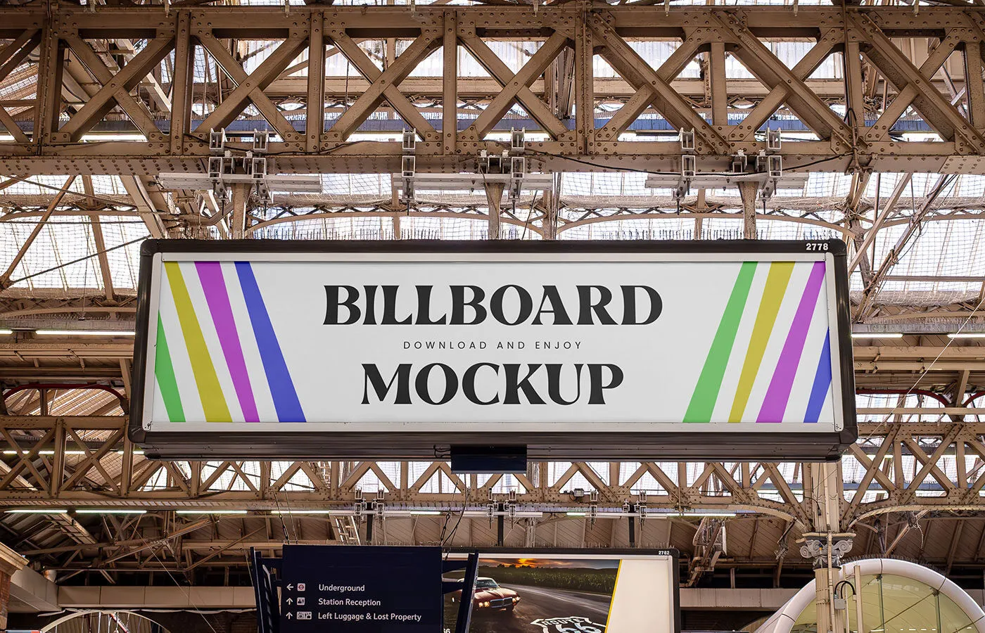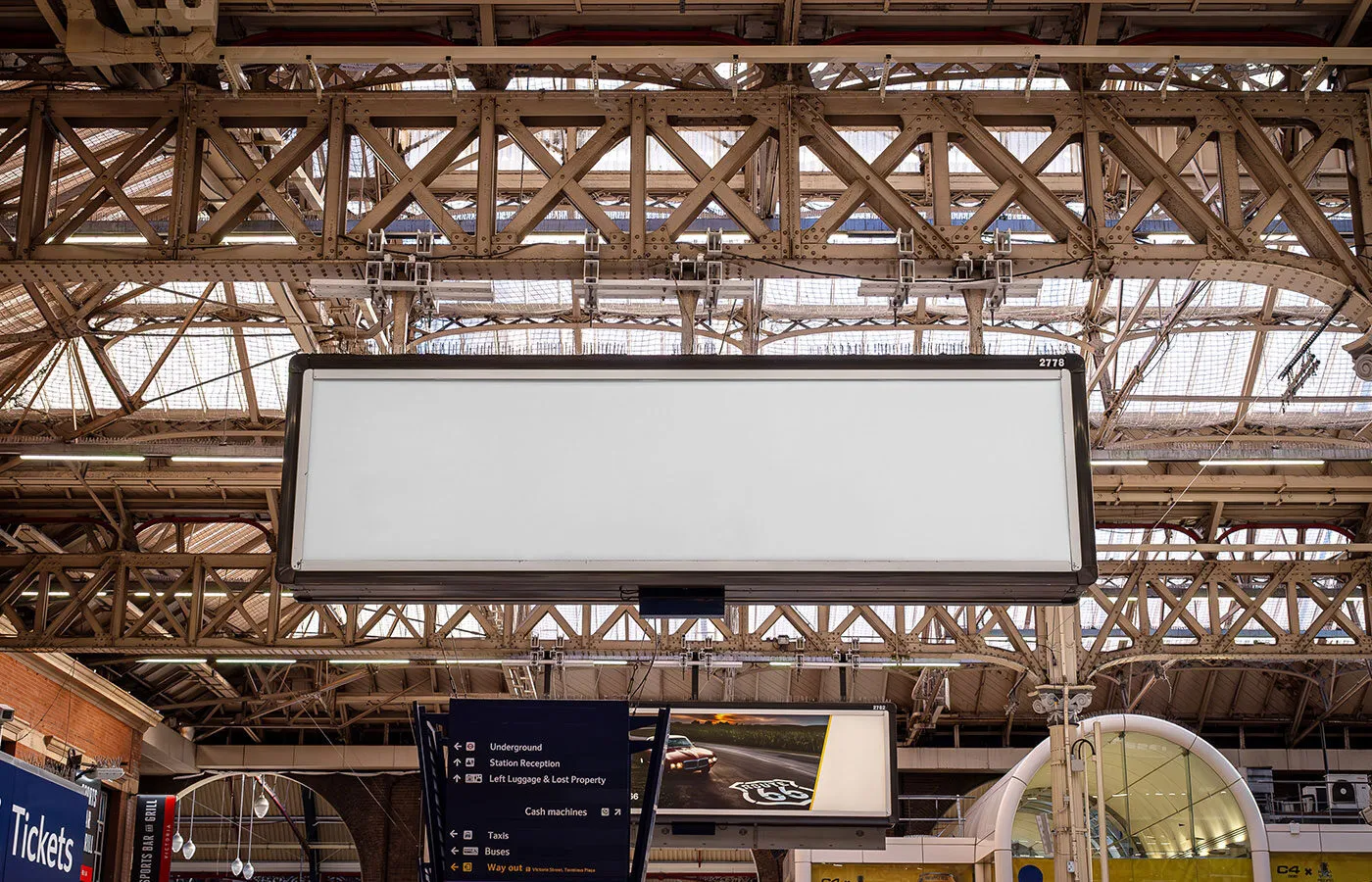 The Facing Sight of Victoria Station Billboard Mockup allows you to present your branding or product in a realistic setting that captures attention. This mockup features detailed elements of Victoria Station, providing a professional backdrop for your advertisement.