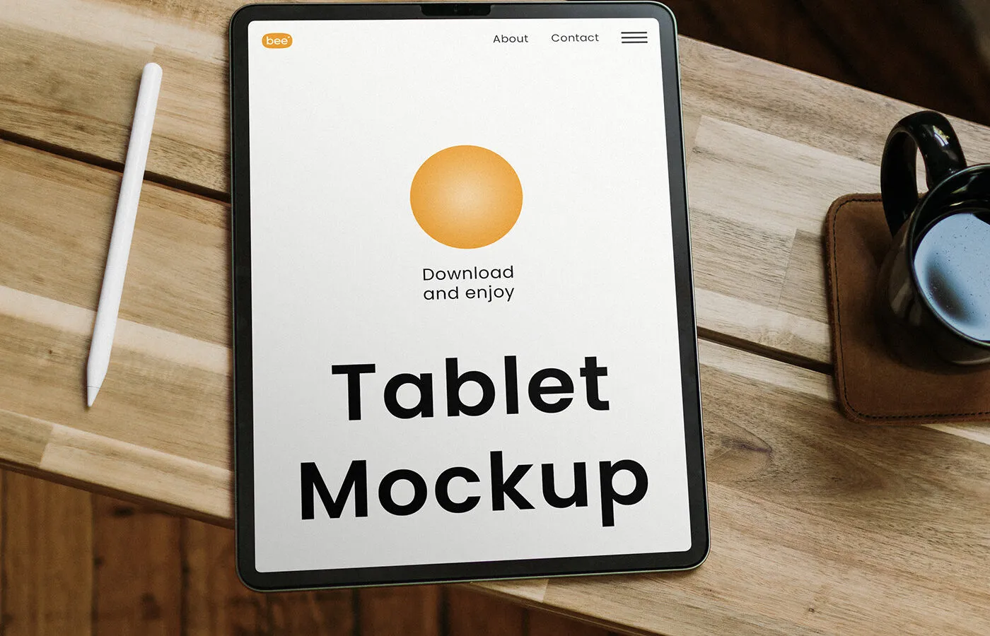 The Facing View of Big Tablet Mockup provides a realistic design that can help make your project stand out. This mockup features a tablet placed on a wooden table next to a cup of coffee, creating an inviting and relatable scene for showcasing your brand.
