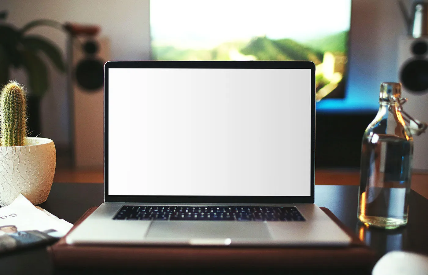 The setting includes a bottle and cactus on a table, adding a unique element to your presentation. The frosted backdrop ensures that the focus remains on your design, making it an ideal tool for showcasing your work effectively.