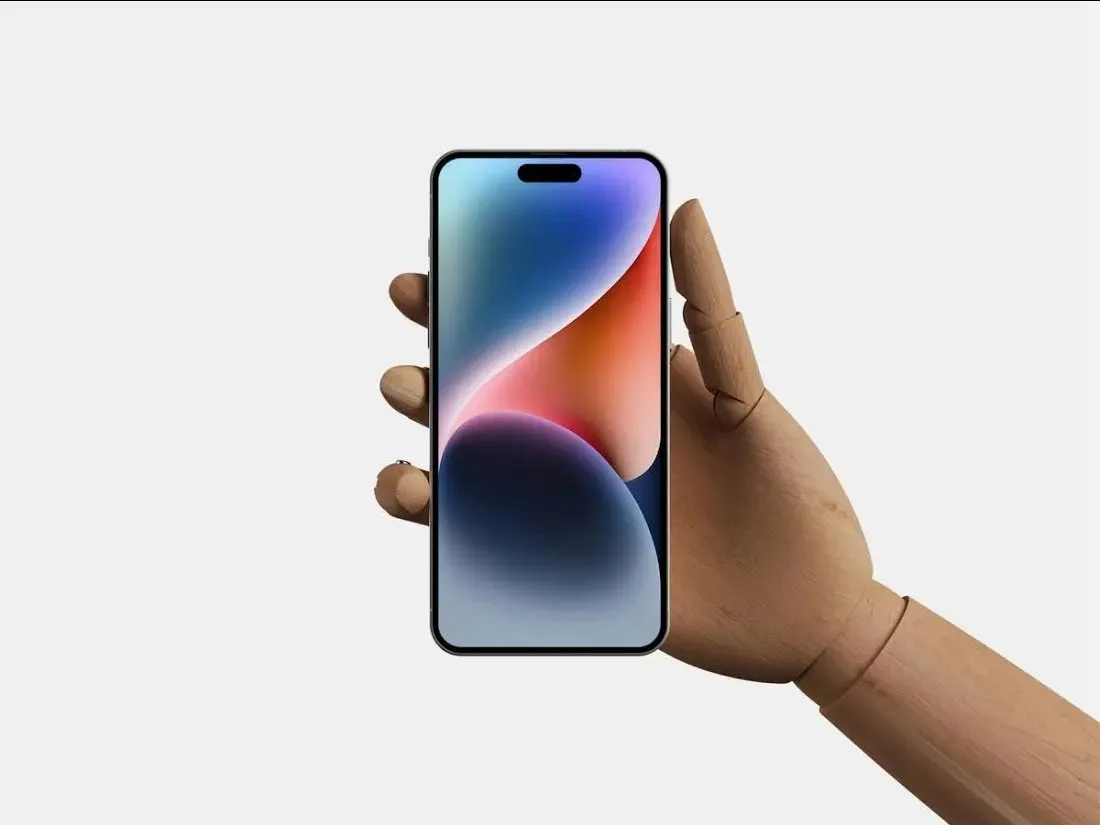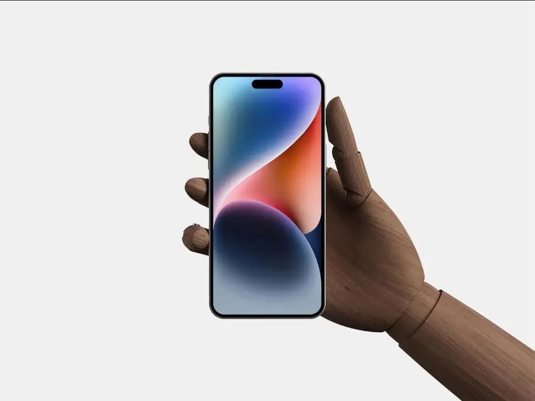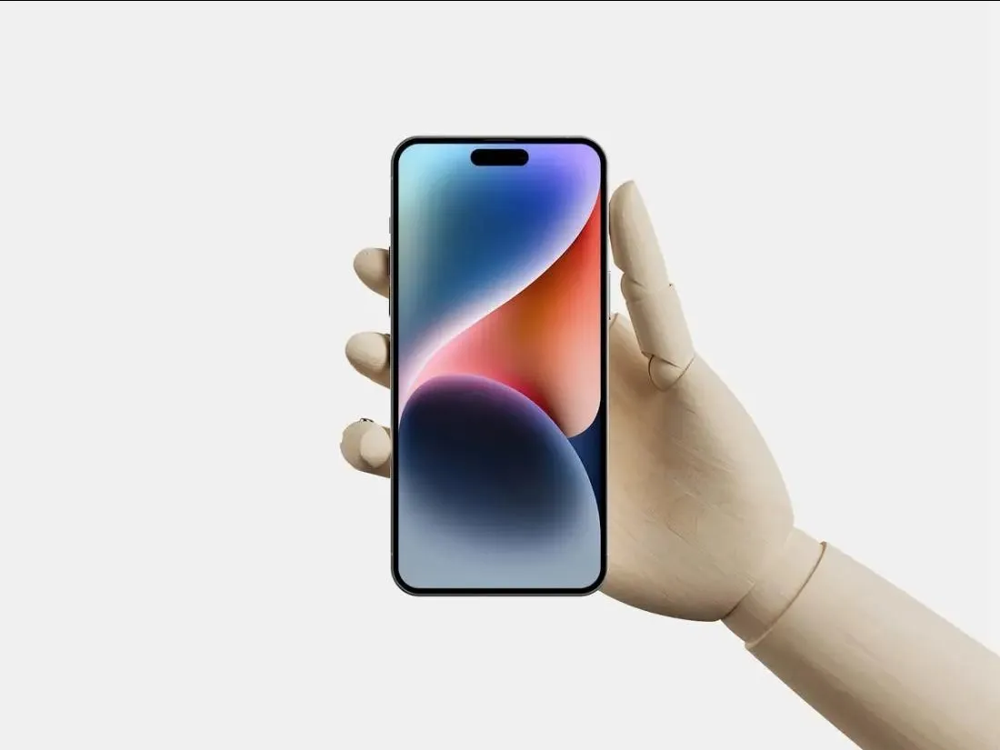 This facing view of a wooden hand holding an iPhone 14 Pro Max mockup offers a unique and eye-catching way to display your design. The unusual combination of a wooden hand and a modern smartphone creates a striking visual that appeals to diverse tastes.