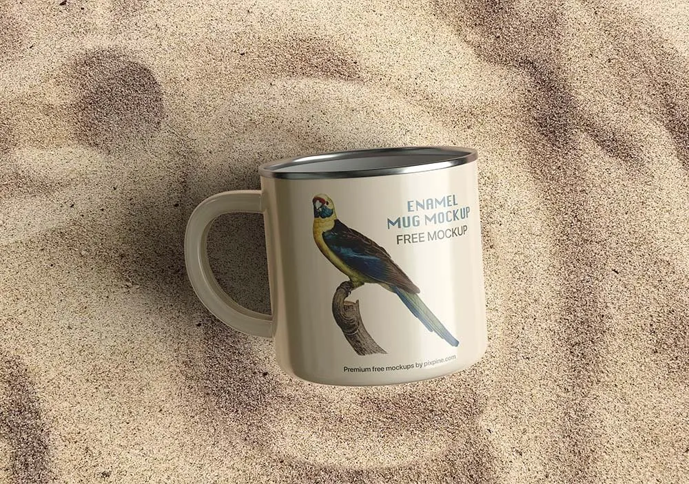 Facing Vision of Enamel Mug Mockup on Sand