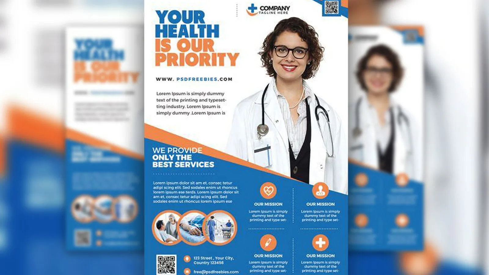 Here is yet another well-designed . It has a flat design, and the default colors of this template are blue, white, and orange, but feel free to change the color scheme in a way that fits the tone of your project. Now that you’re interested, you can grab the neatly layered PSD file of this flyer for free and get to work.