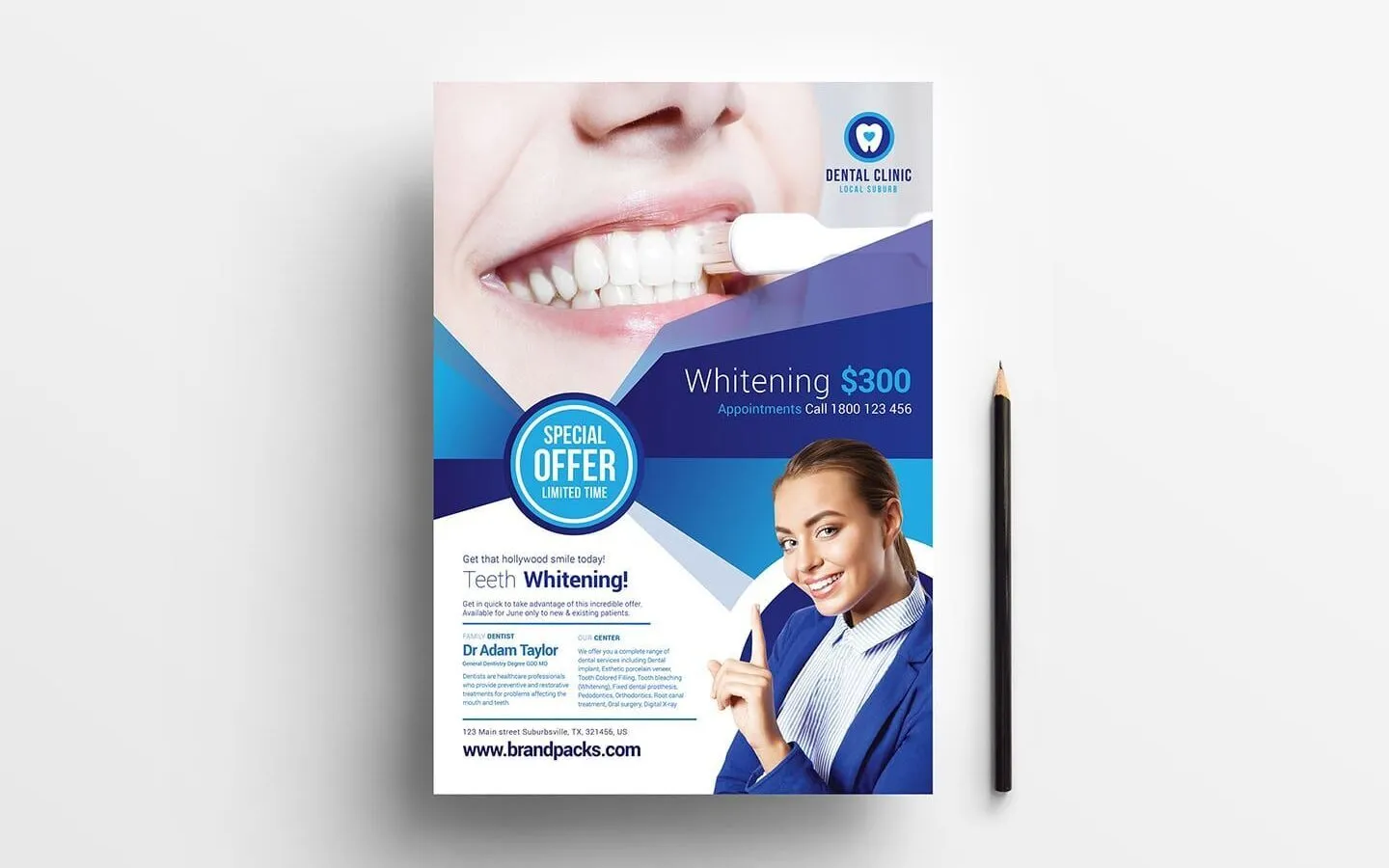Have you ever observed a dental-related advertisement without a photo of a smiling person with white teeth? One is also available in today’s template, which indicates this file can promote dentists and dental clinic jobs. There is one spot where you can add your logo or sign.