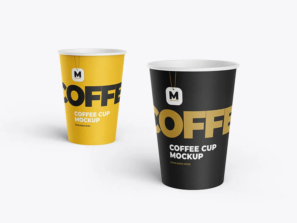 This set includes four PSD files designed to showcase your coffee or tea branding projects. Each file features a front view of standing paper cups, allowing you to easily apply your branding and logo designs. One of the cups is depicted with a lid that is not fully secured, adding a touch of realism.