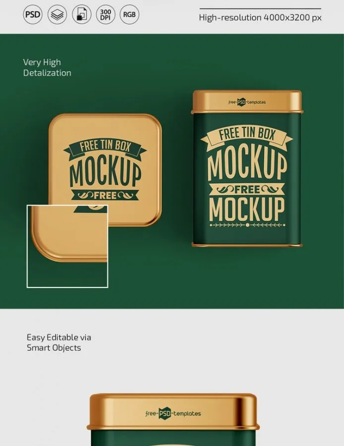 Today’s product can step up your presentation game with another realistic freebie. This is the front and perspective view of 3 tin . There is a realistic modern setting for these boxes and you can see how your design will shine in real places. You can showcase any kind of container design in real settings and with high quality to further impress your client.