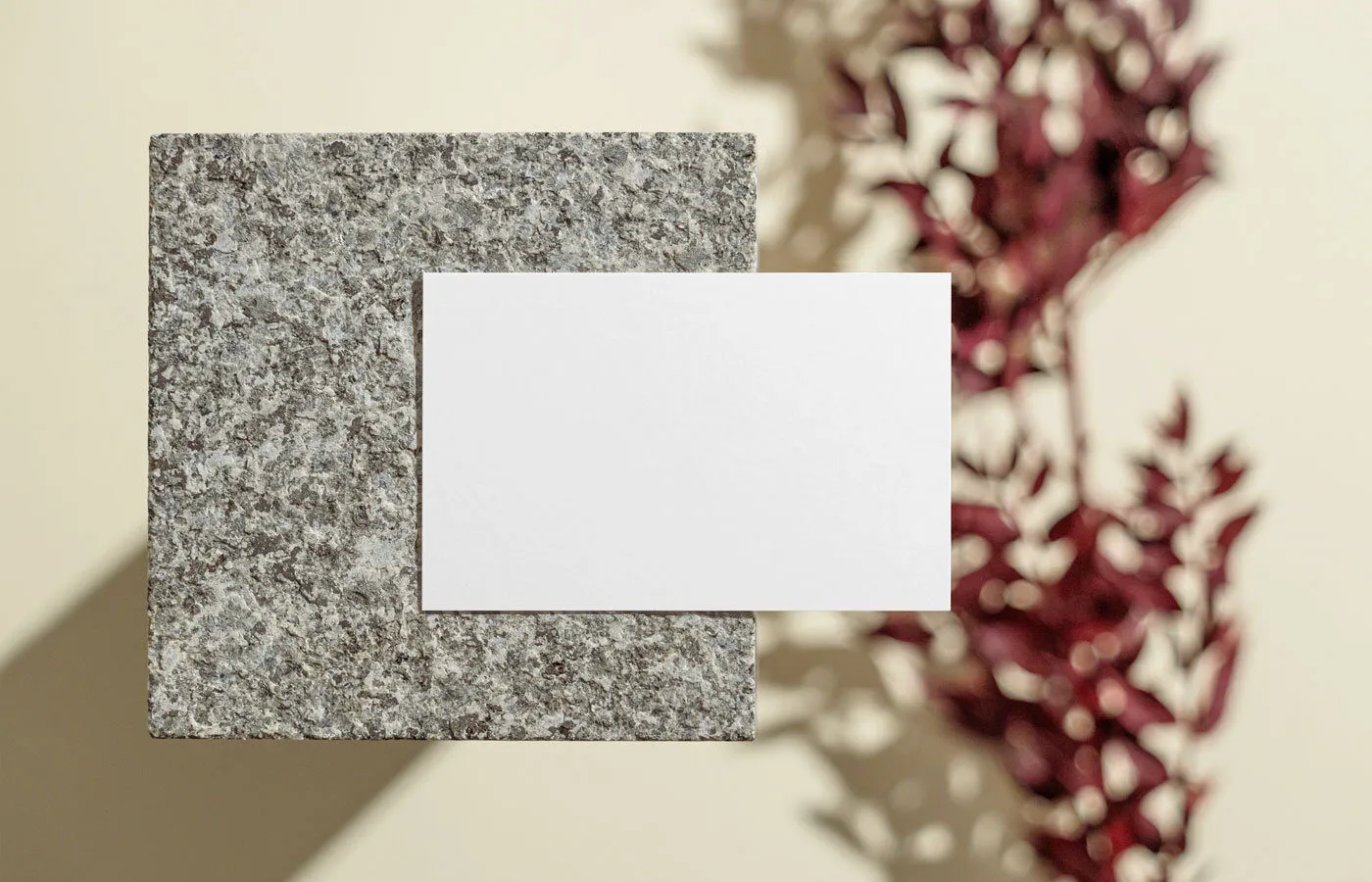 With a few chic and modern details, you can present a beautiful design of your business card like this item and make it memorable. With a beautiful view of a business card placed on a granite block, this product presents a unique image on an opaque background.