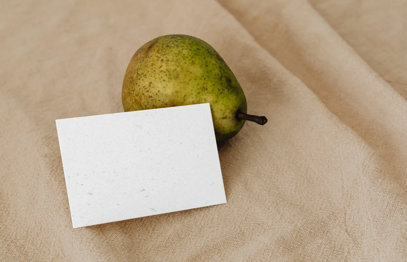 With a simple and unique design, you can have a deep impact on your audience and this conveys such a feeling. Creating a notable design by displaying a card next to a pear on a nice and soft surface will give you a perfect show.