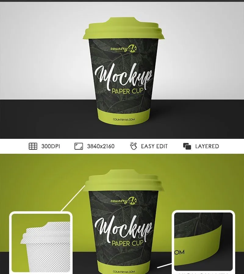 This product features a front view of a paper cup with a paper lid, perfect for displaying various design concepts. The mockup is fully editable, allowing you to easily apply your own designs to the cup and present them to clients or stakeholders effectively.