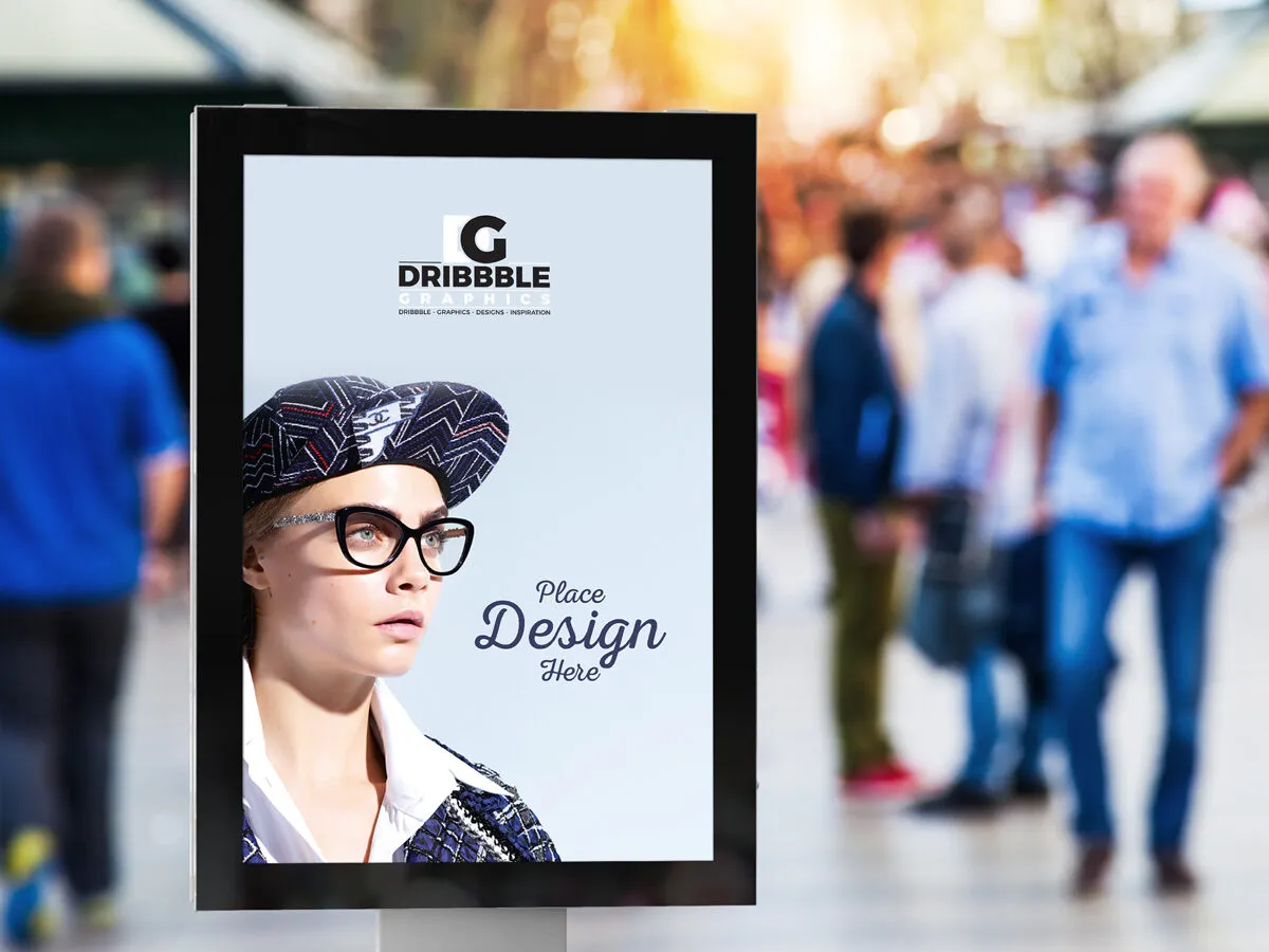 If you’ve been looking for a realistic vertical for your design, then today is your lucky day. Here you see the front view of a vertical billboard in a public place. The frame of the billboard is simple and black, which can be matched to any color.