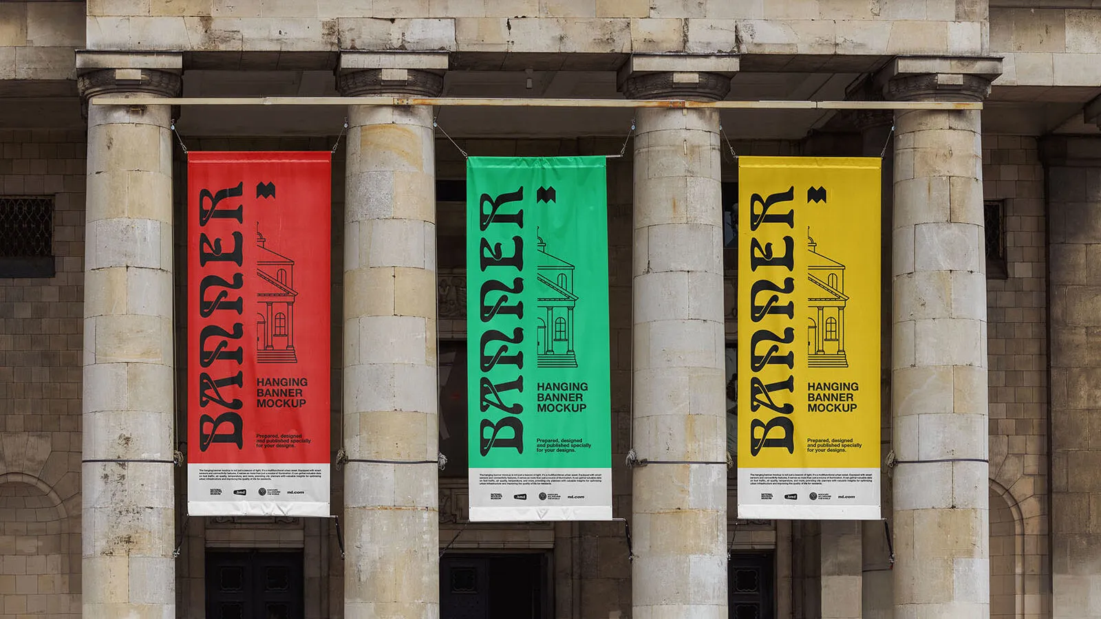 The Front View of Hanging Banners Mockup offers a realistic depiction of three banners displayed in a casual setting with an urban feel. This mockup is a useful tool for showcasing your designs in a visually appealing way.