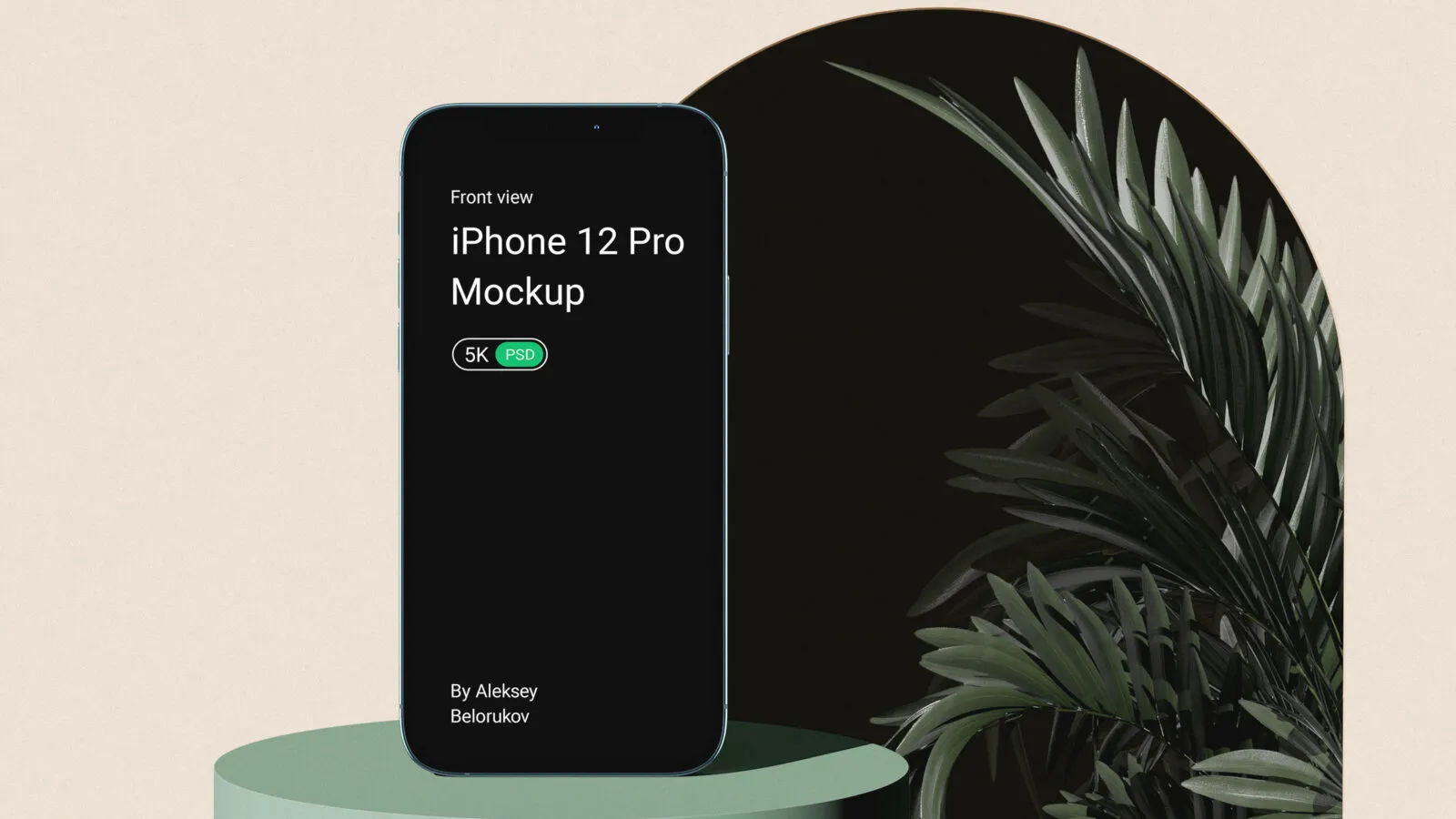 This product features a front view mockup of the iPhone 12 Pro, accompanied by a plant for a modern and stylish presentation. The setup provides a unique perspective that highlights the phone’s design and can enhance your project’s visual appeal.
