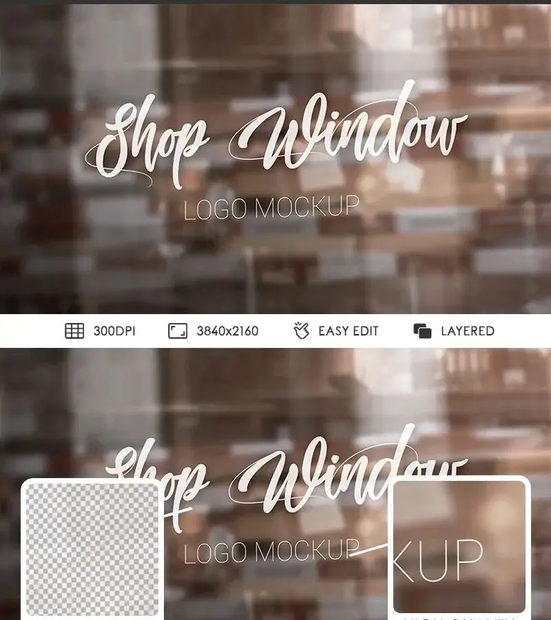 The Front View of Logo on Shop Window Mockup is designed to highlight your logo designs effectively. It features a clear front view of a window with a blurred background, directing all focus to the logo you place on the glass. This mockup allows you to easily insert your logo or sign designs onto the window surface with just a few clicks.